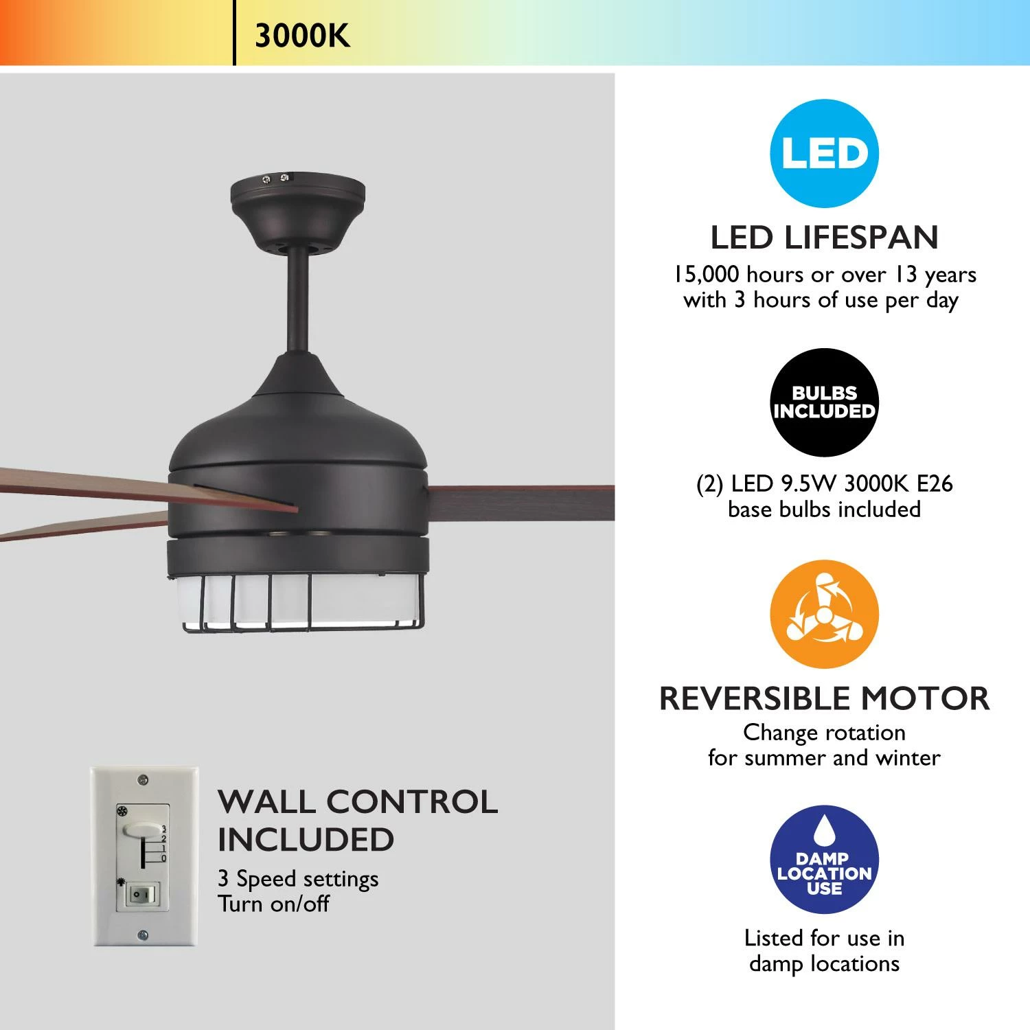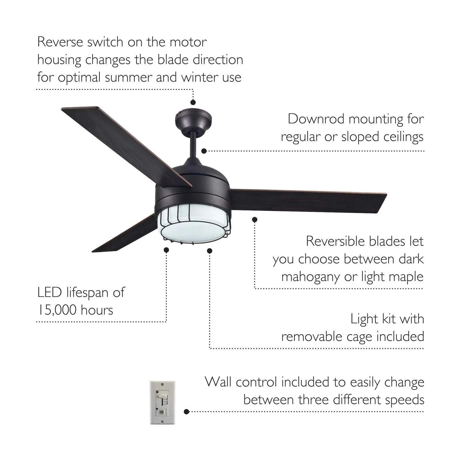 - Easily change between three different speed settings with the wall controller (included)