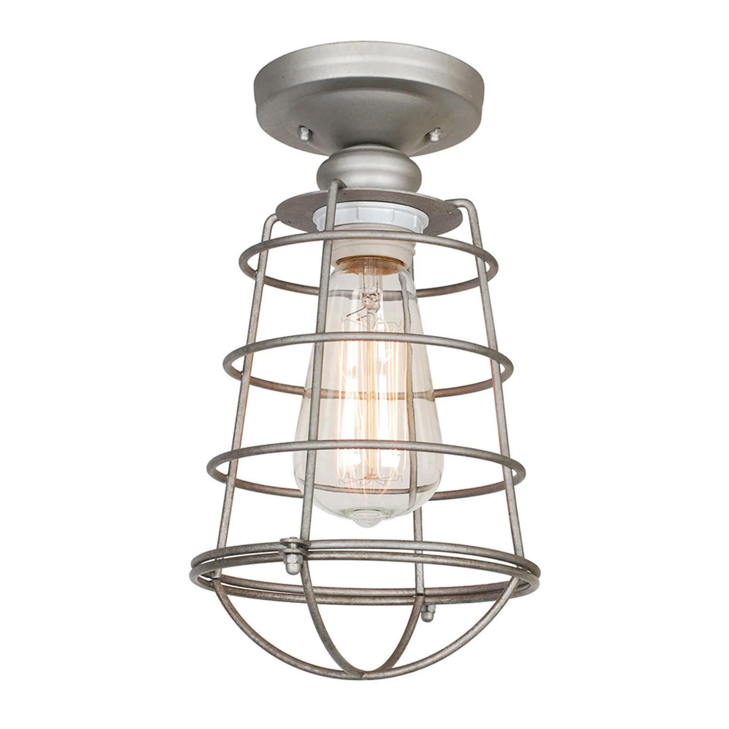 - Ideal for bedrooms, hallways, closets, foyers, and more, this rustic industrial ceiling light has a galvanized finish with a wire metal shade