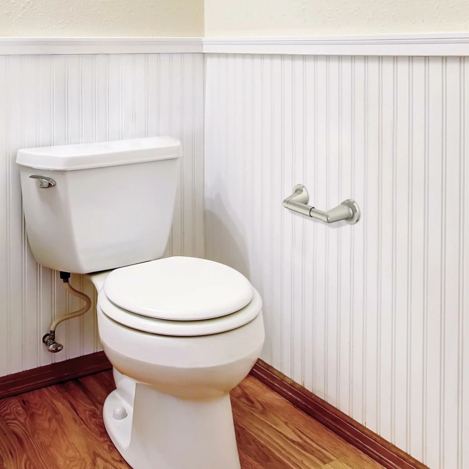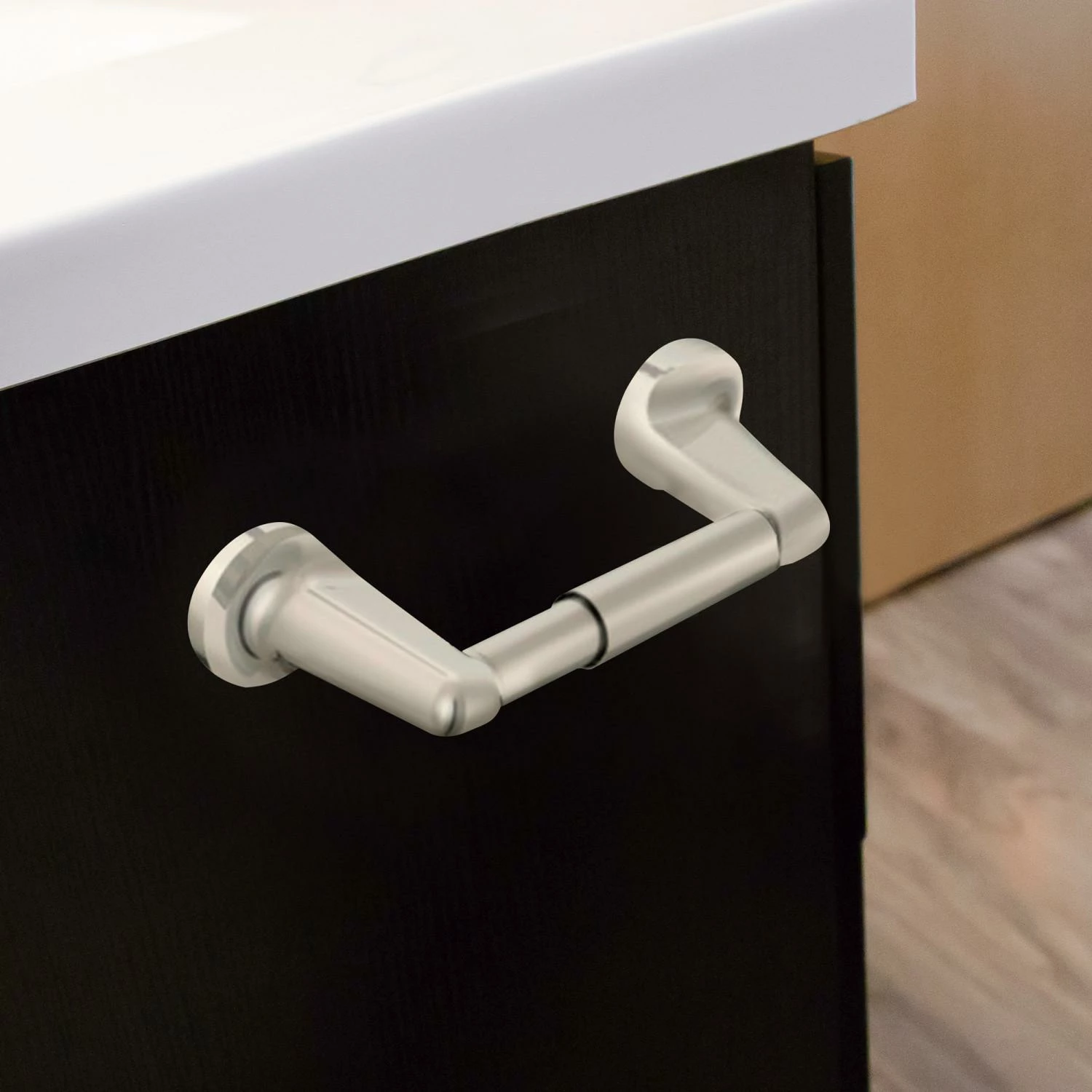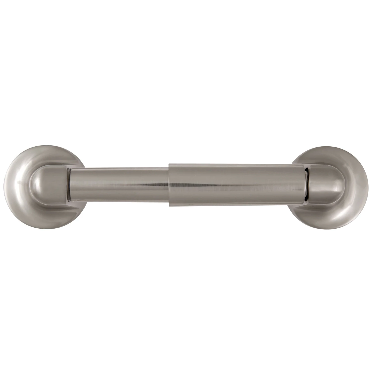 The Design House 558148 Alta Bay collection has a sleek, smooth style that brings a finished look to your bathroom. This modern toilet paper holder is made of zinc and comes in a brushed nickel finish. Features include simple access for changing toilet paper quickly and easily and concealed screws for a clean look. Pair with other items from the Alta Bay Collection for a coordinated style.