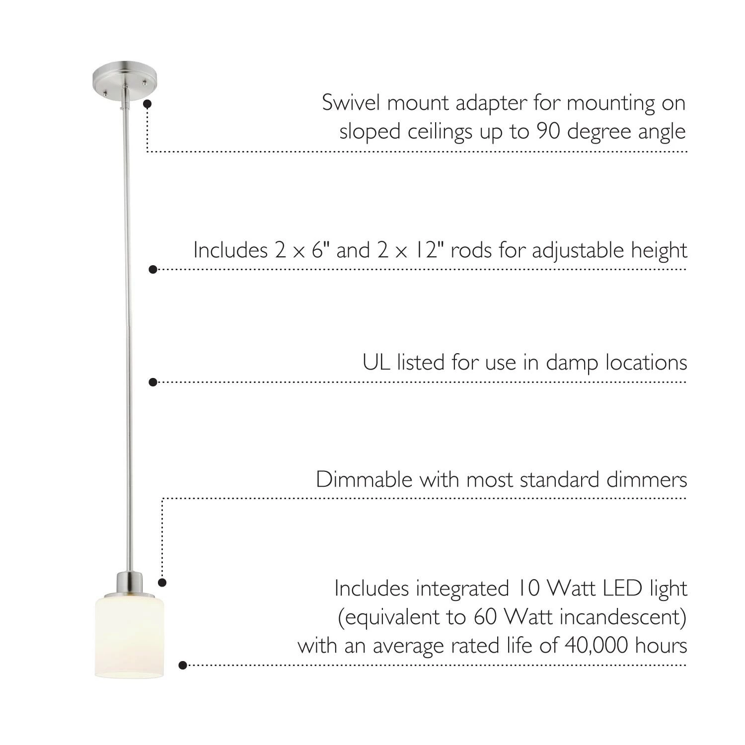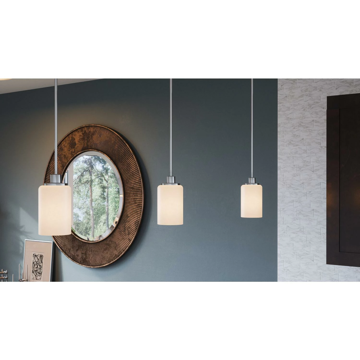 - Traditional with modern elements mini pendant has a satin nickel finish with a cylinder-shaped frosted white glass shade