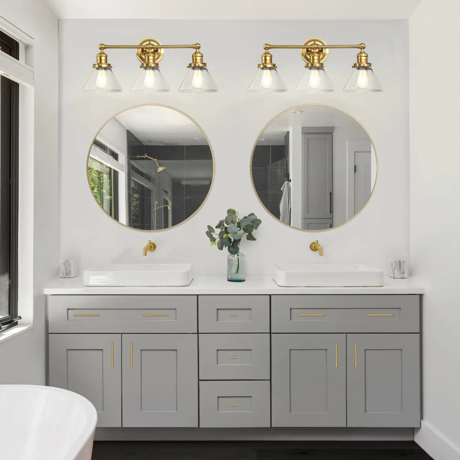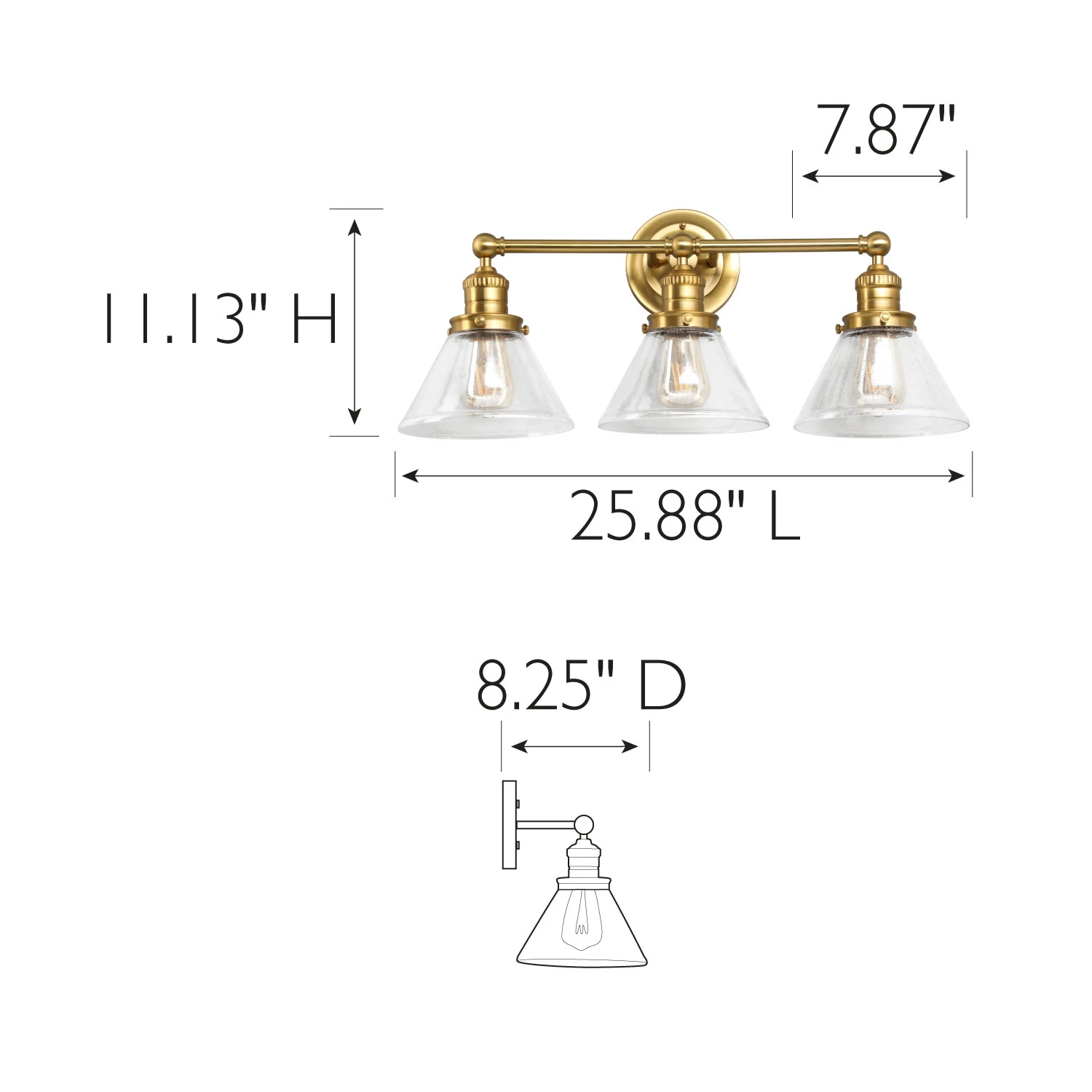 - Ideal for bathrooms, this light fixture has a satin gold finish with Clear, seedy glass cone-shaped shades