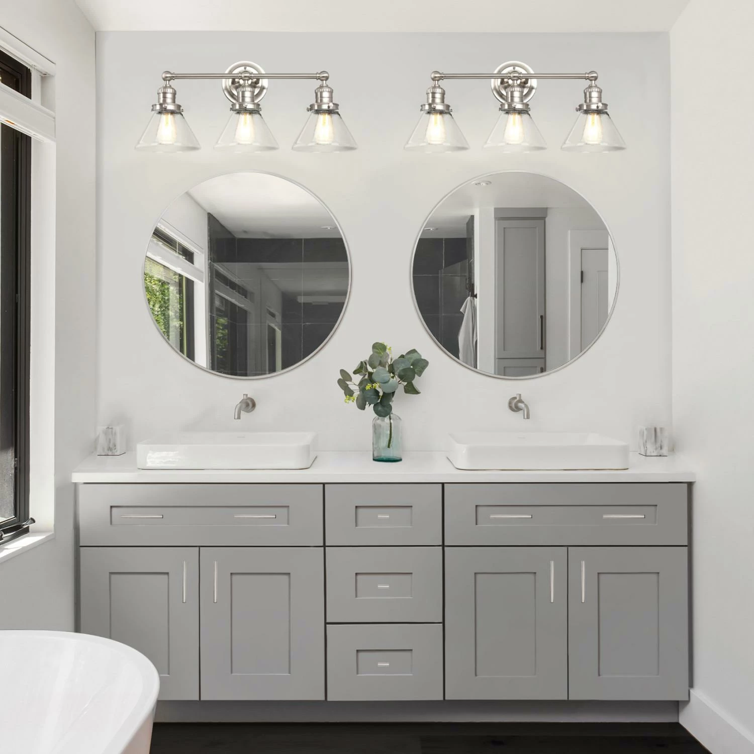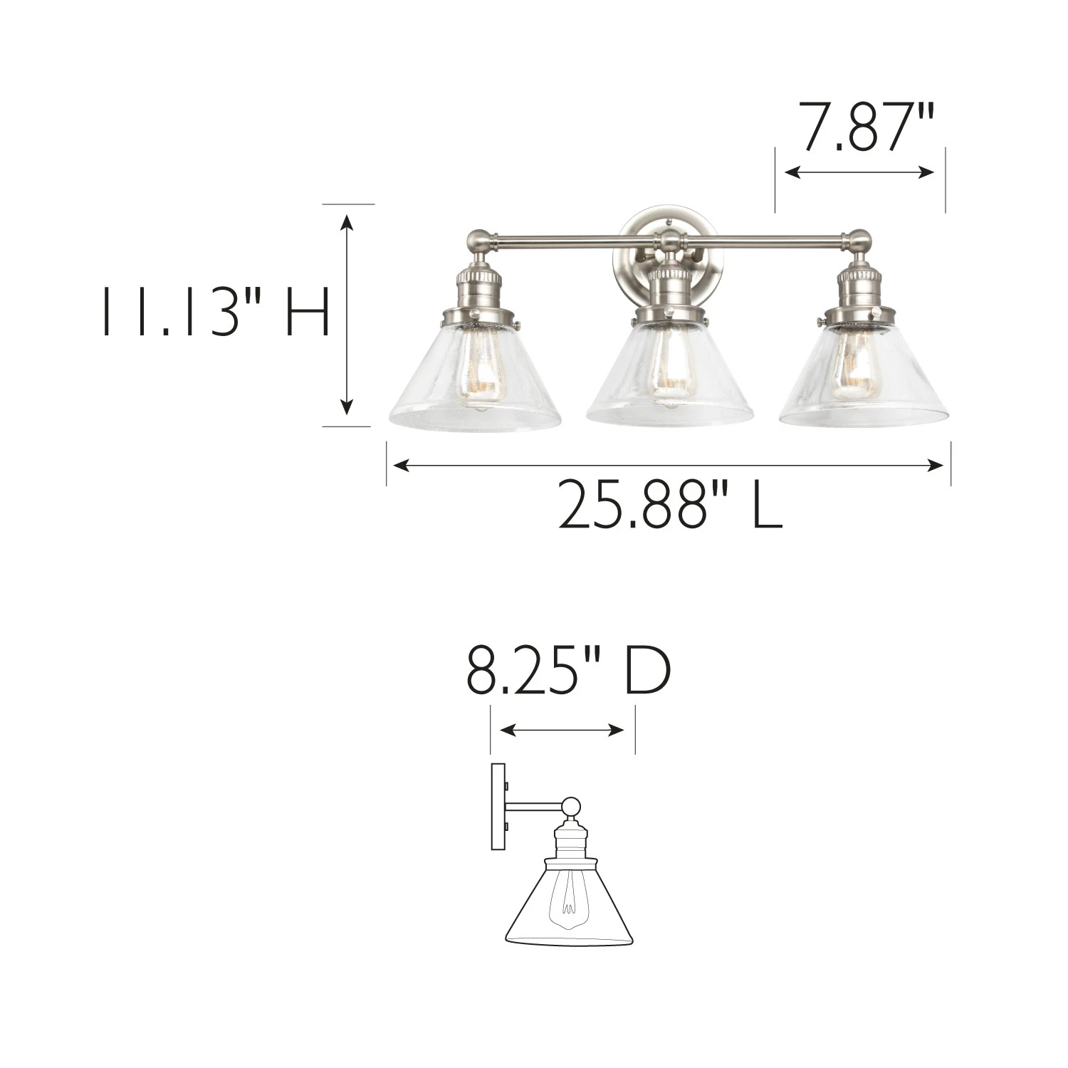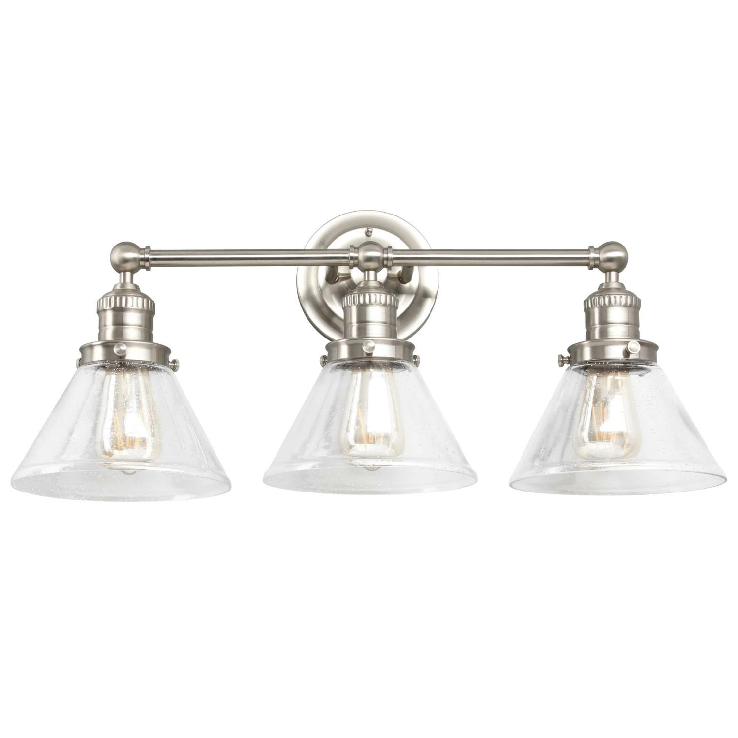 - Ideal for bathrooms, this light fixture has a satin nickel finish with Clear, seedy glass cone-shaped shades