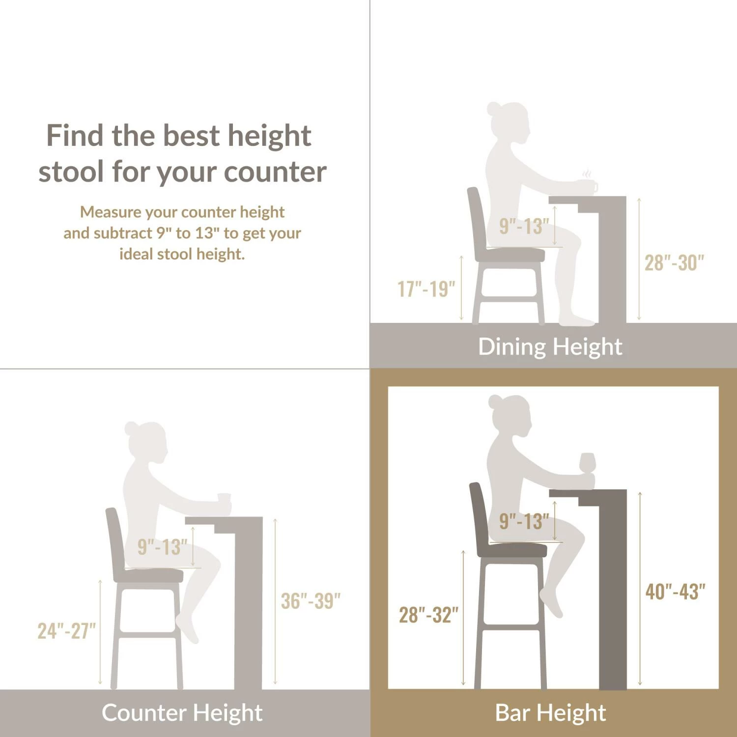 - Bar Height Stool: Measures 20.75 inches L x 23.25 inches W x 42.5 inches H and is compatible with bars and tables 40 to 43 inches high; set of 2