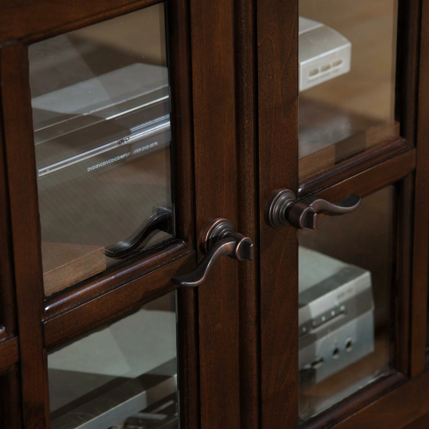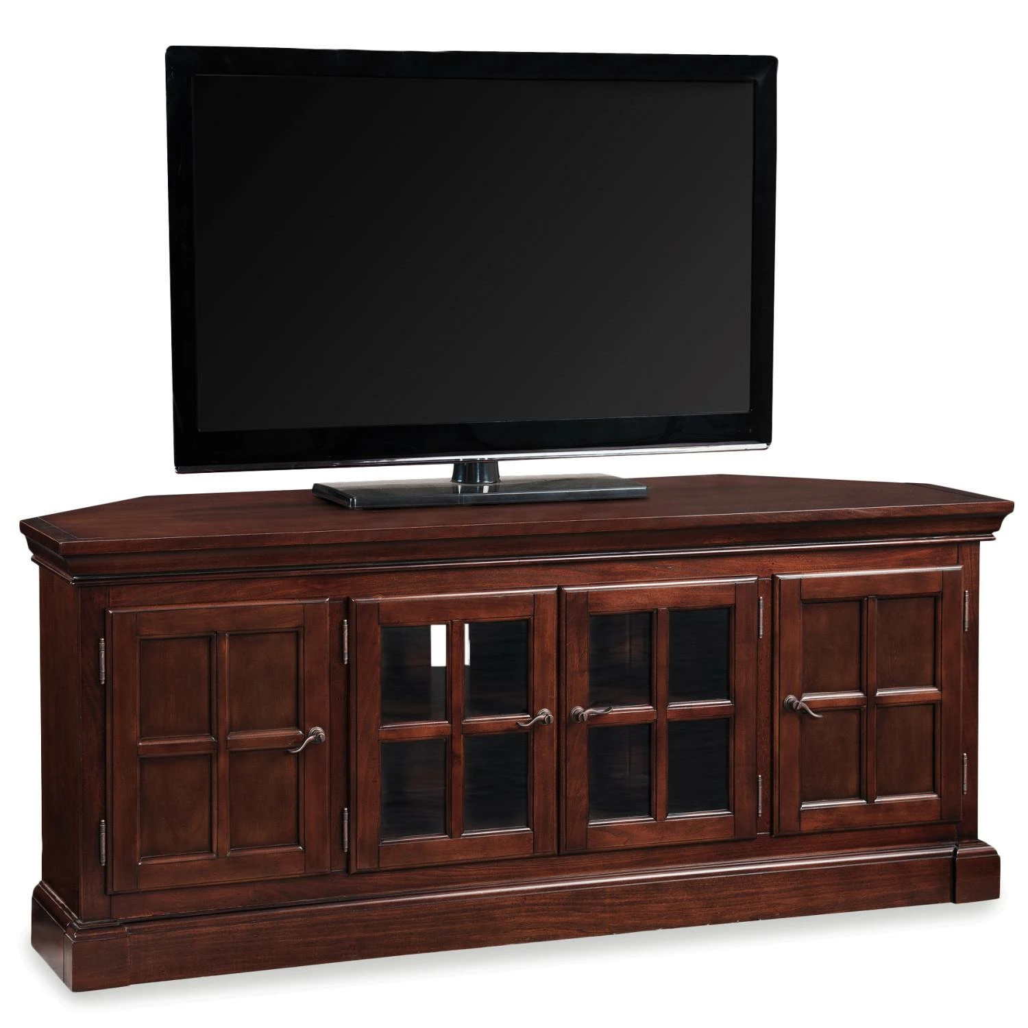 Deep, rich woodtones embellish the craftsmanfoots touch–serpentine shaped top edge details, architectural plinth base, mullioned door elements and a unique, custom bronze lever complete the masterful design. Infrared friendly glass doors and adjustable shelves house components in the center bay with tidy behind door storage in the two outside bays. Designed and manufactured by Leick Home, the trusted source for quality home furnishings for every taste and budget.