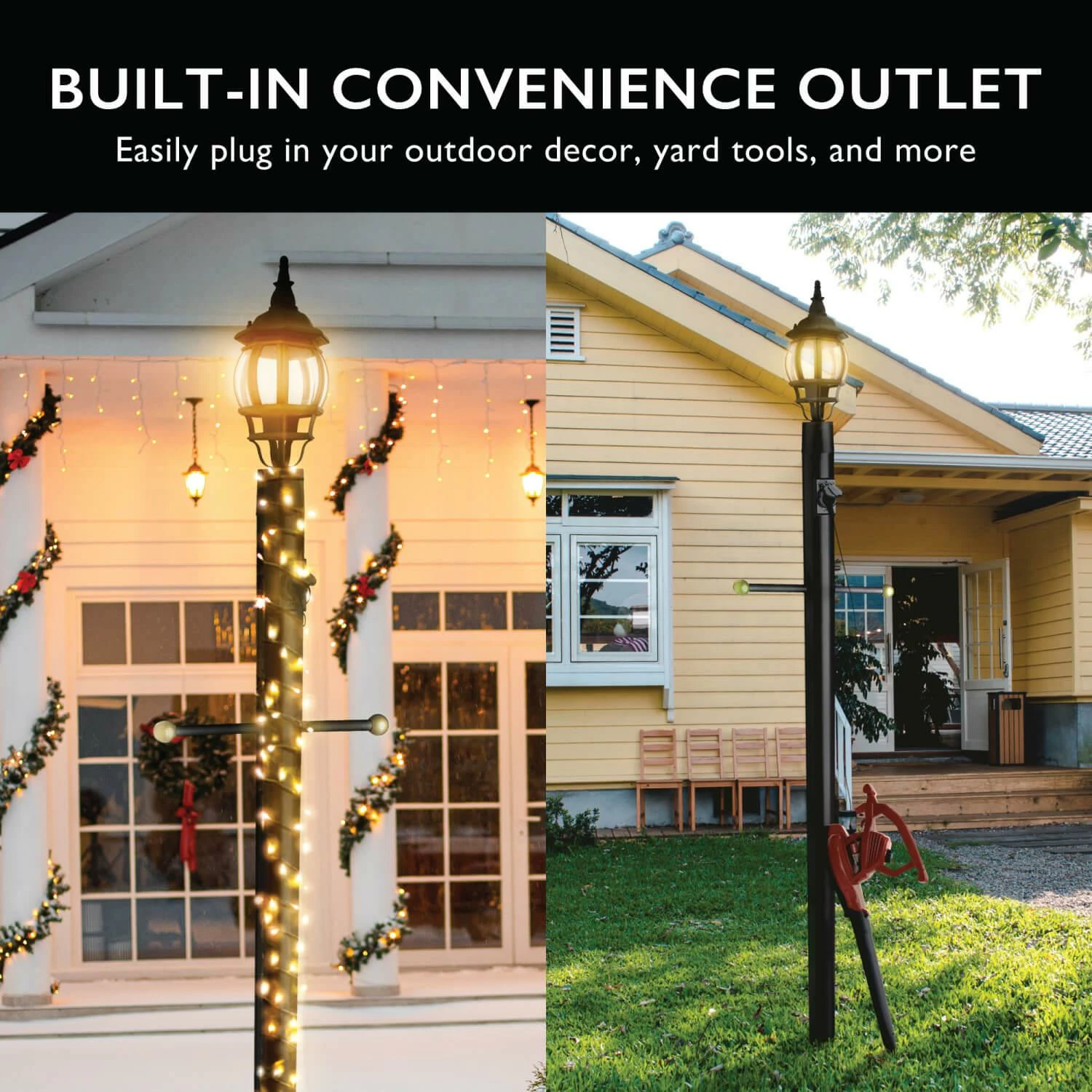 - Integrated Outlet: Convenient outlet for holiday decorations or lawn equipment with side opening for wire feed