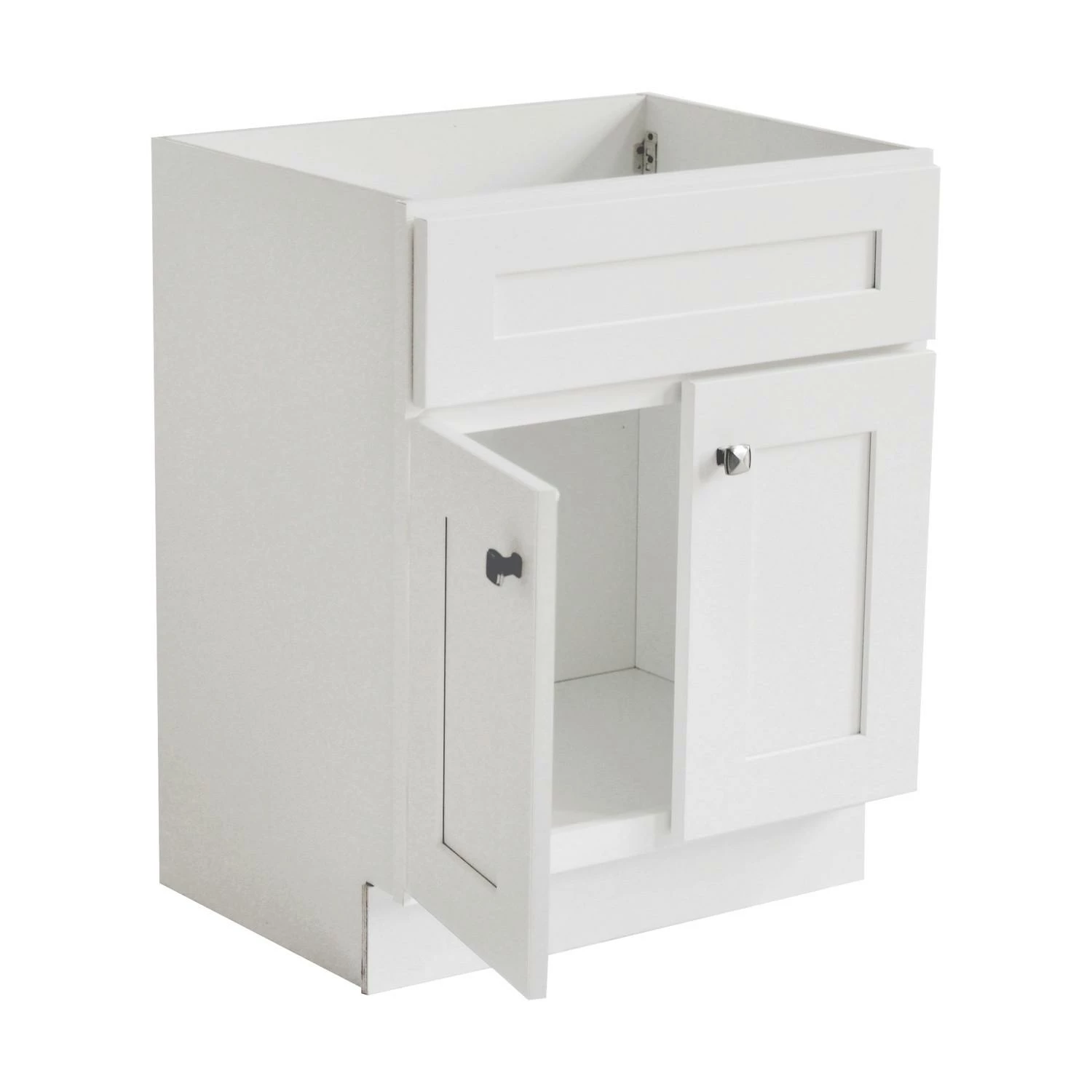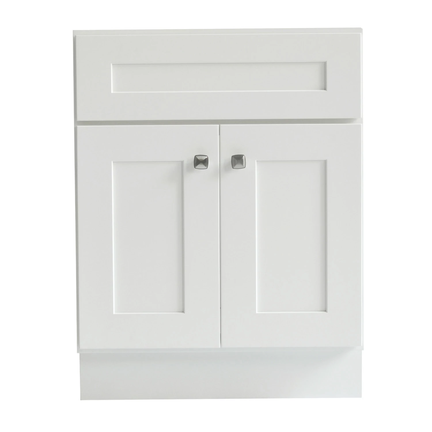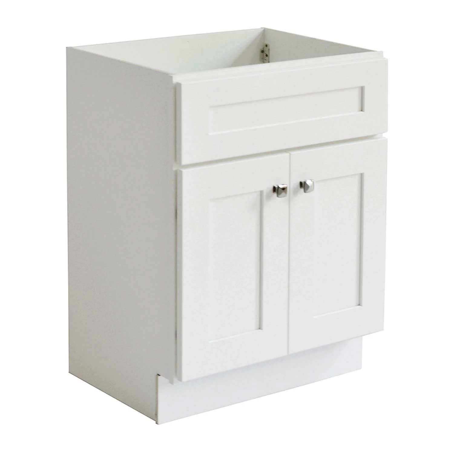 This Design House Brookings 24inch Bathroom Vanity Cabinet offers a look that will match any style, from rustic to modern. All vanities come equipped with 6-way adjustable soft-close hinges so your doors can remain as quiet as possible. Features include a 3inch wide shaker door trim, 1/2inch plywood with poplar veneer for side and bottom panels, and a 3/4inch solid maple face frame. Our RTA (ready to assemble) cabinets use a metal clip connector system, making the assembly process fast and easy. Style of drawers/doors: Shaker, Number of drawers: 0, Number of doors: 2, Number of shelves: 0.