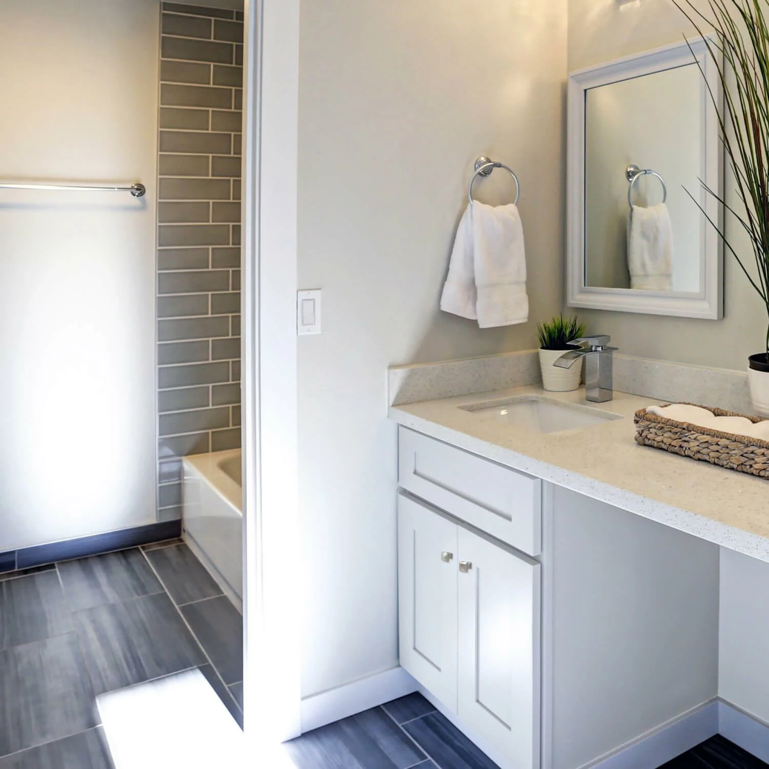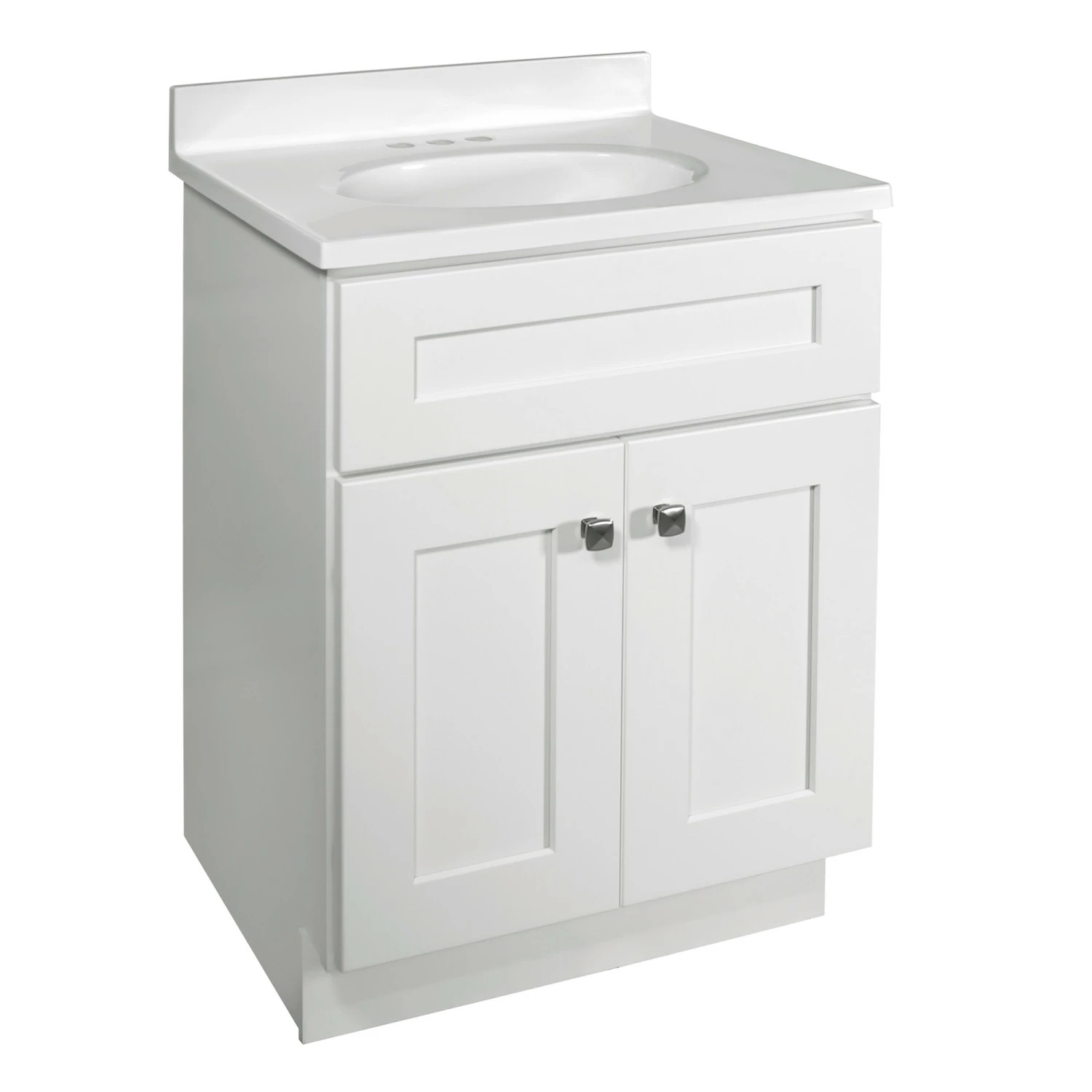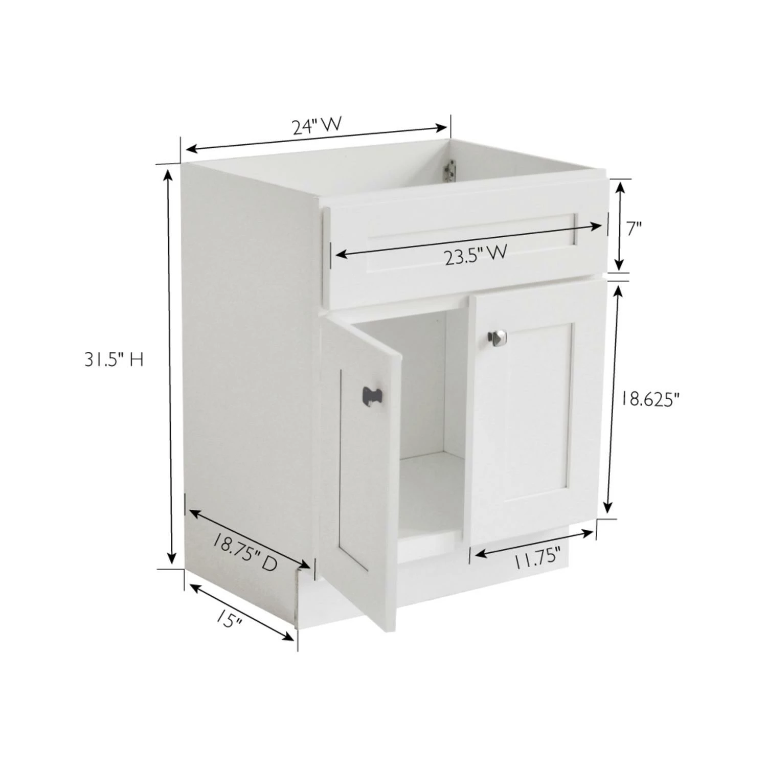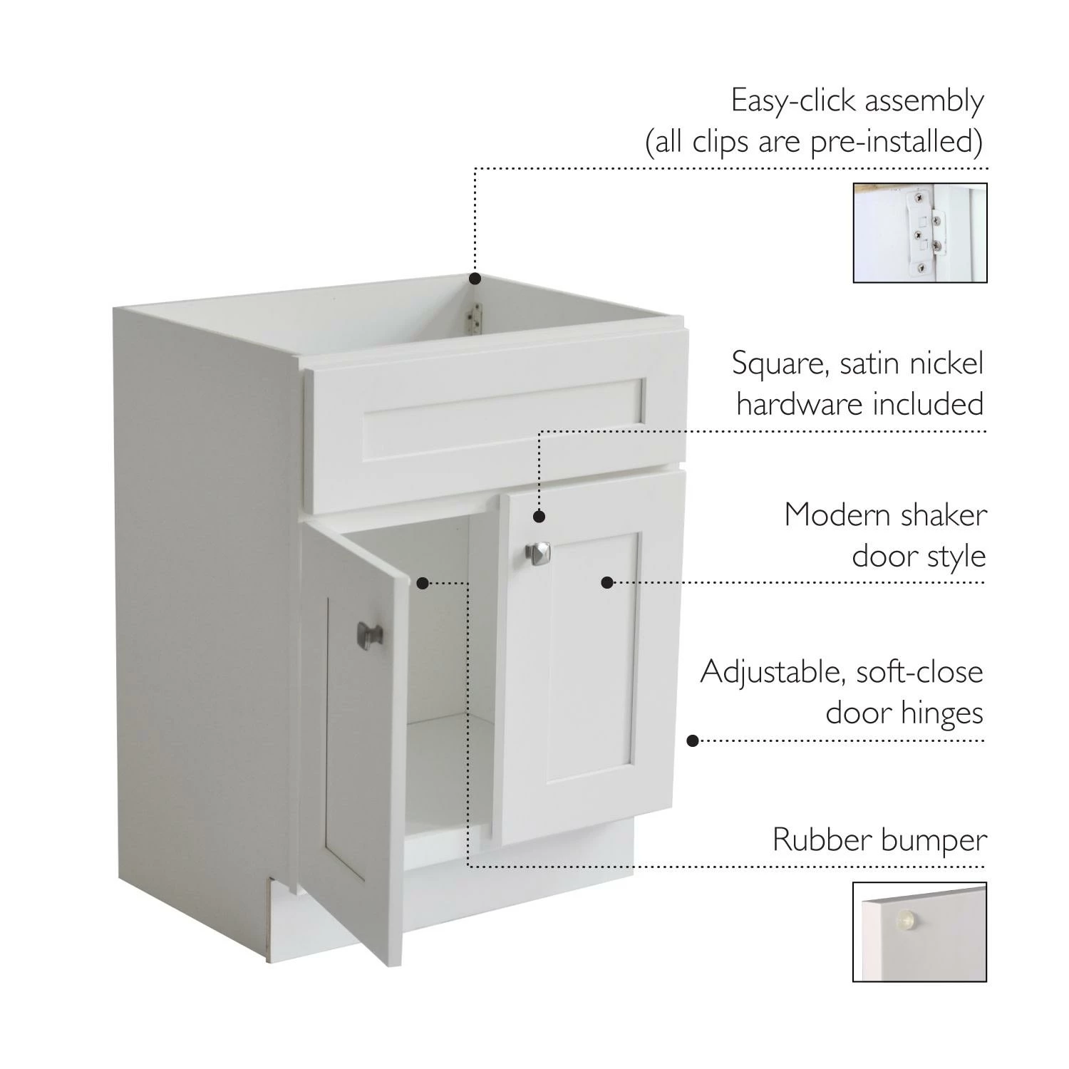 This Design House Brookings 24inch Bathroom Vanity Cabinet offers a look that will match any style, from rustic to modern. All vanities come equipped with 6-way adjustable soft-close hinges so your doors can remain as quiet as possible. Features include a 3inch wide shaker door trim, 1/2inch plywood with poplar veneer for side and bottom panels, and a 3/4inch solid maple face frame. Our RTA (ready to assemble) cabinets use a metal clip connector system, making the assembly process fast and easy. Style of drawers/doors: Shaker, Number of drawers: 0, Number of doors: 2, Number of shelves: 0.