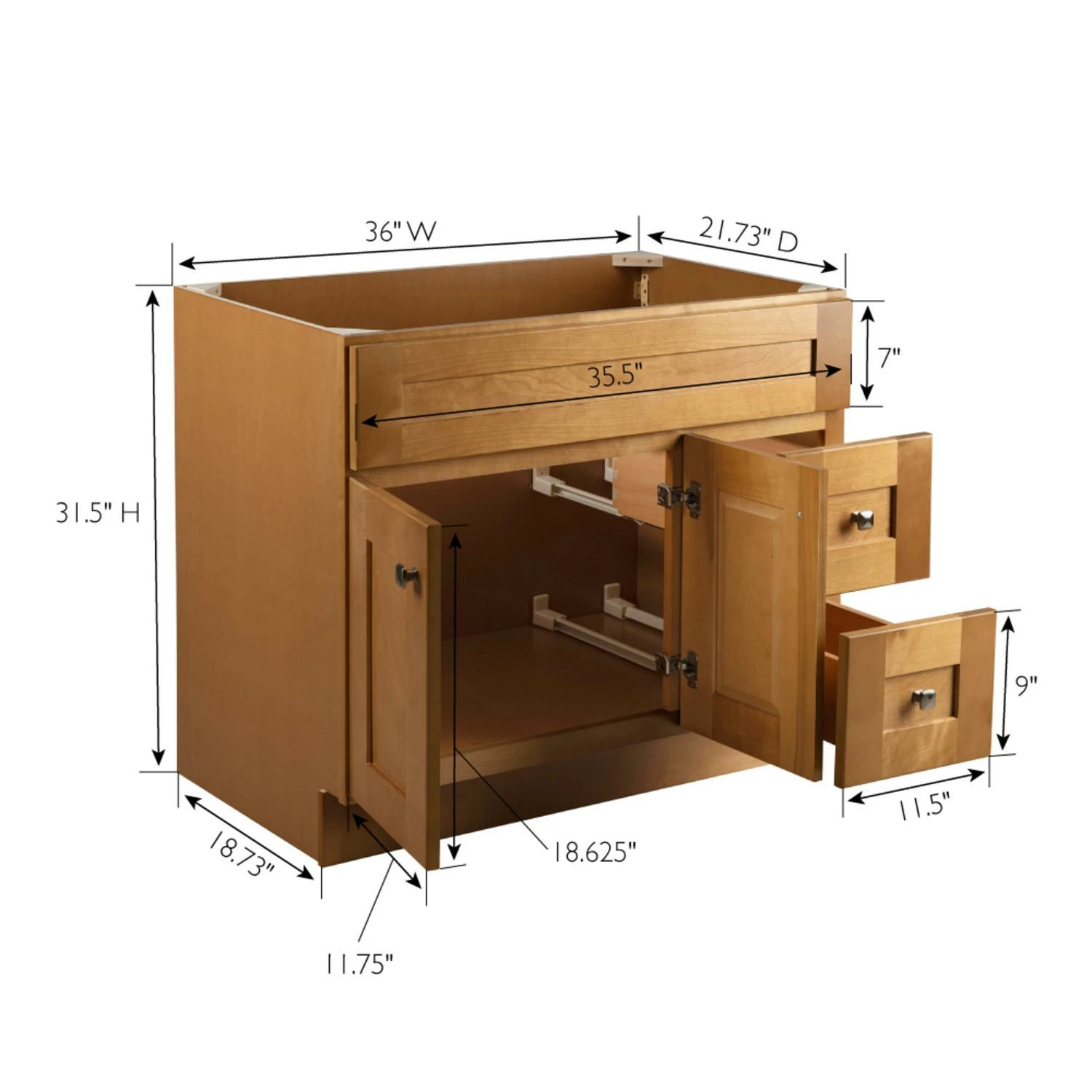 The Design House Brookings 36inch Bathroom Vanity Cabinet offers a look that will match any style, from rustic to modern. All vanities come equipped with 6-way adjustable soft-close hinges, and slow-close drawer glides so your doors and drawers can remain as quiet as possible. This cabinet includes a 3inch wide shaker door trim, 1/2inch plywood with poplar veneer for side and bottom panels, and a 3/4inch solid maple face frame. Our RTA (ready to assemble) cabinets use a metal clip connector system, making the assembly process fast and easy. Style of drawers/doors: Shaker, Number of drawers: 2, Number of doors: 2, Number of shelves: 0.