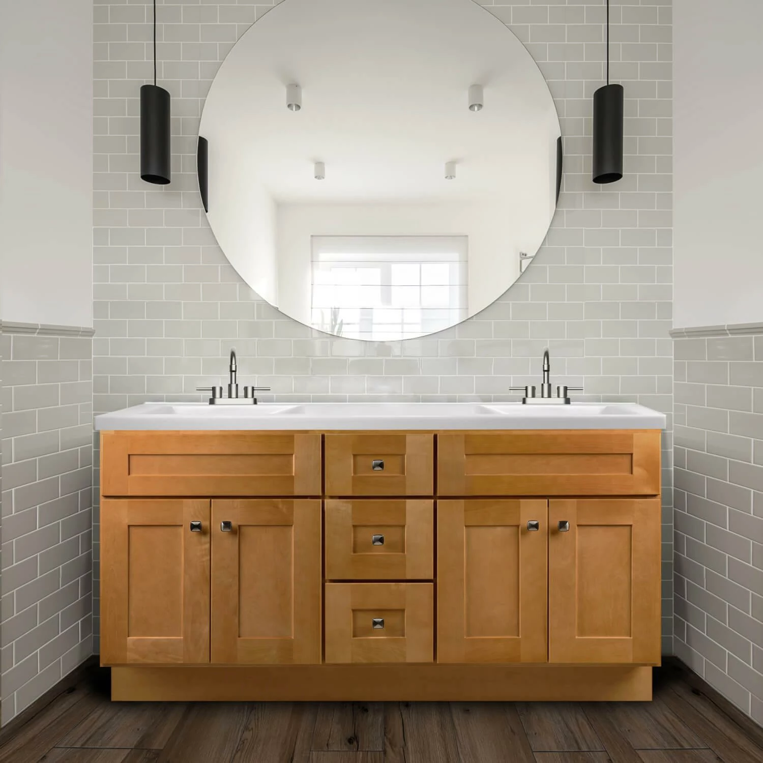 - Shaker-style raised door design, finished in natural wood-toned Modern Birch