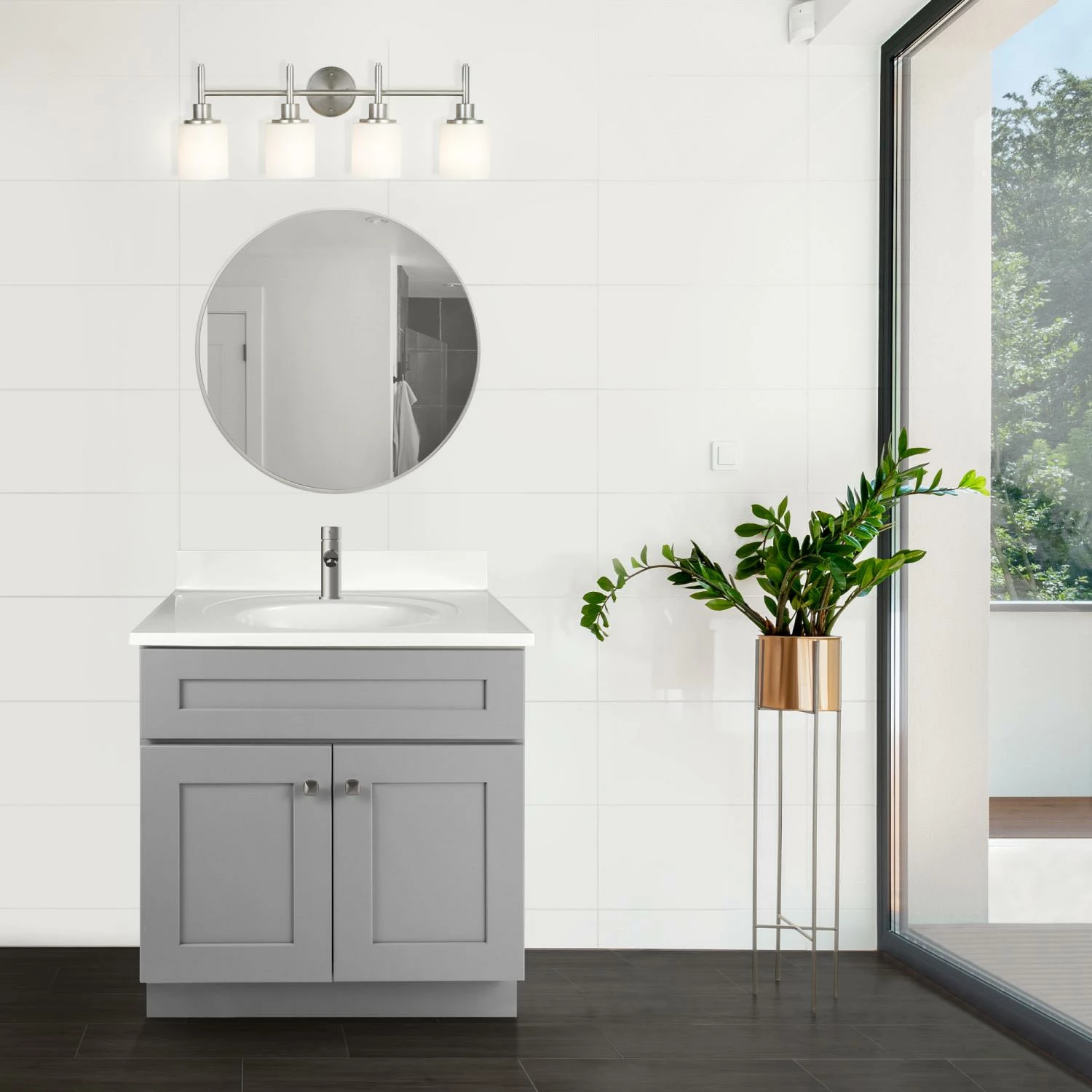 With a classic design, the Brookings Shaker style vanity set takes a simple approach to contemporary decor. Gently recessed paneling creates a smooth, framed look upon each door front finished in gray, perfect for showcasing the square, satin nickel knobs included with this piece. Optimized to fit your bathroom space, this 2-Door vanity will store all your essentials and keep clutter out of sight. The Brookings vanity is stylishly paired with a stunning solid white cultured marble top, creating a united look with the crisp gray base and providing long-lasting durability for years to come. One single hole is pre-drilled atop an oval bowl to install your faucet and an integrated backsplash helps prevents water damage. This countertop’s squared edges add a modern design to appeal to contemporary tastes. The vanity base measures 30-inches by 21.73-inches and comes unassembled. Designed and manufactured by Design House, the trusted source for quality lighting, hardware, plumbing, kitchen, and bath products for every taste and budget.