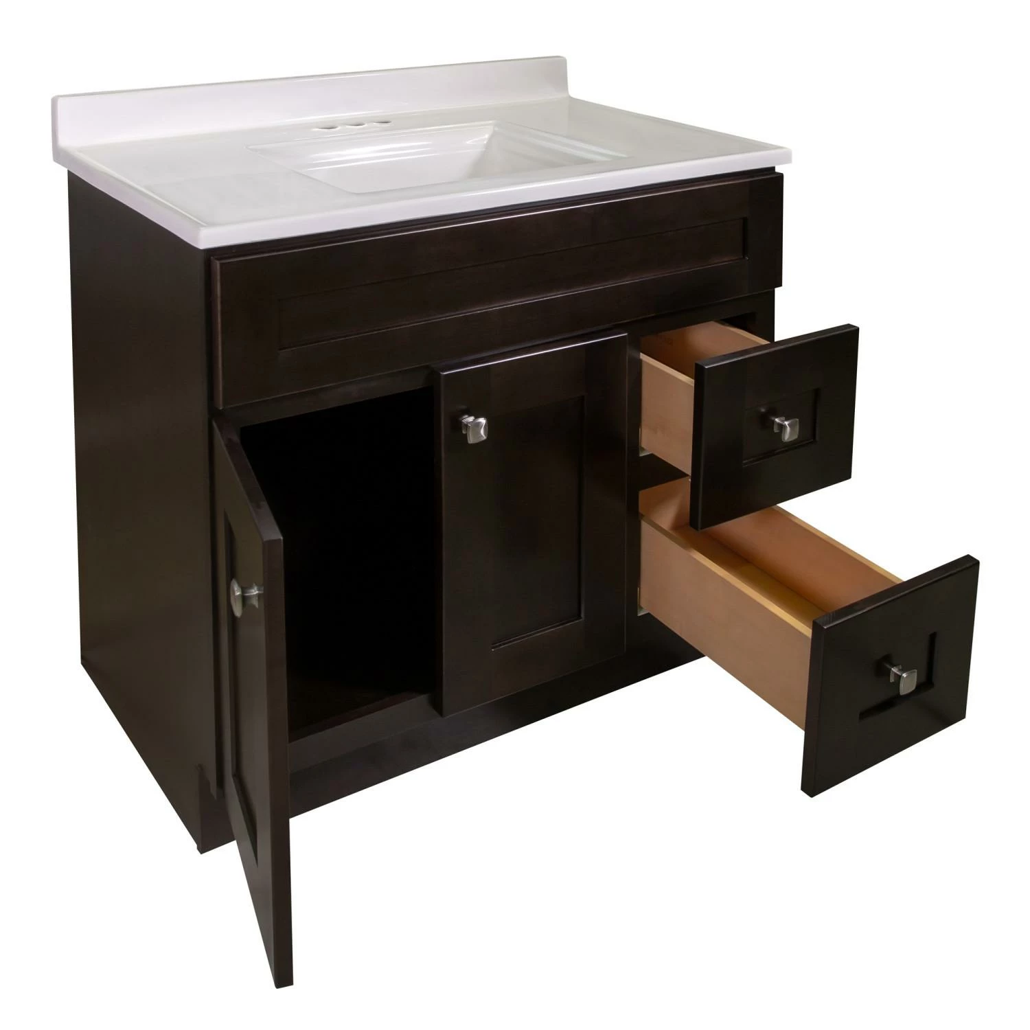 - Single sink bathroom vanity set with 2 doors and 2 fully functional drawers in a Durable, water-resistant Espresso finish with solid White cultured marble top has a non-porous surface that is easy to clean and stain resistant