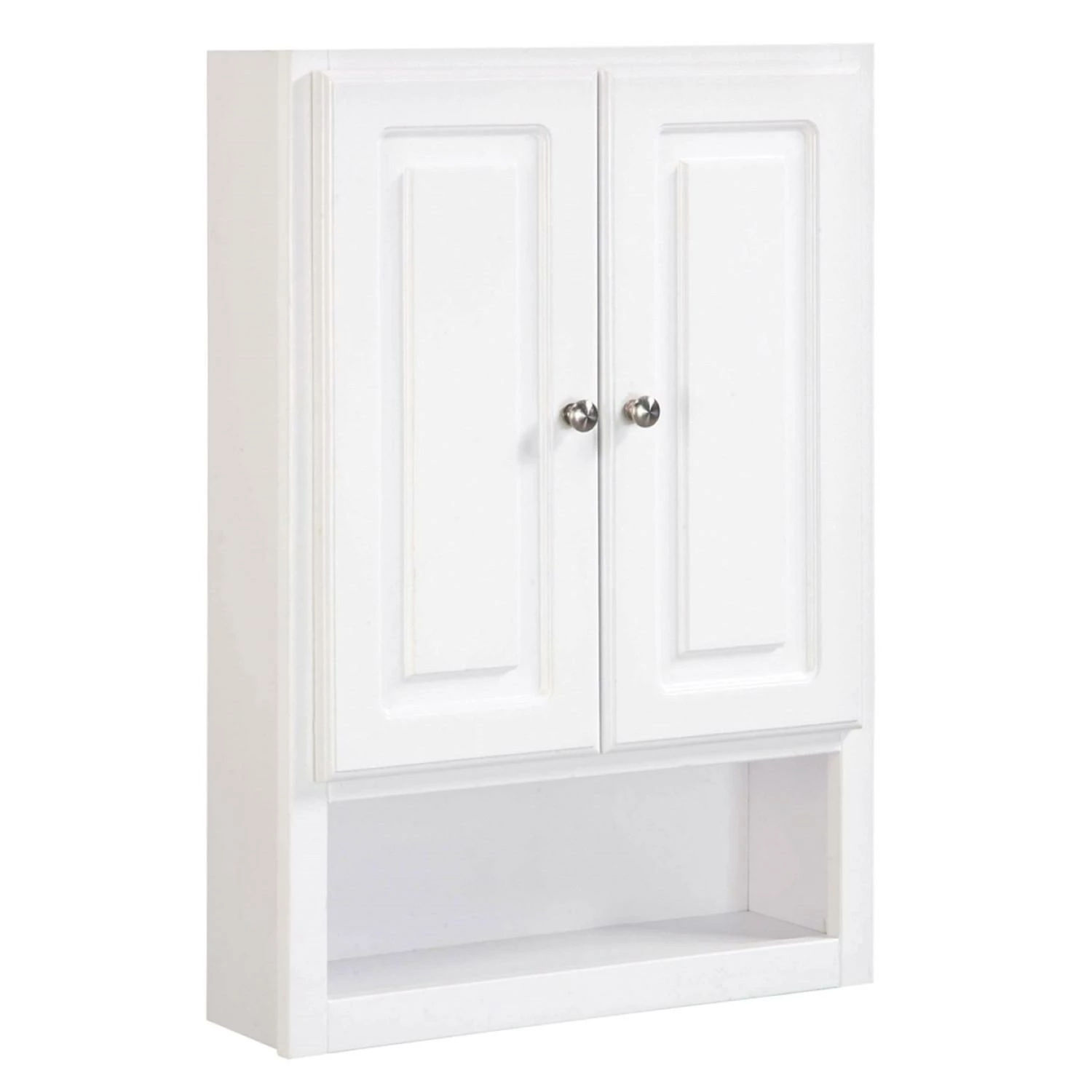 Give your bathroom a boost of elegance with the Design House 587055 Concord White Wall Bathroom Cabinet. It features a durable white finish and satin nickel hardware. Perfect for any style home, this cabinet has clean lines and concealed hinges. The 2-door, 1-shelf construction gives you plenty of storage to keep your bathroom neat and tidy. The panel doors open with a fluid motion. Measuring 21 inches by 7 inches by 30 inches, this cabinet fits in a variety of sized bathrooms or laundry rooms and provides ample storage. Modern construction meshes with subtle vintage details for an elegant addition to your bathroom. This product is perfect for remodeling your bathroom to add additional storage. Designed for surface mount installations. Designed and manufactured by Design House, the trusted source for quality lighting, hardware, plumbing, kitchen, and bath products for every taste and budget.