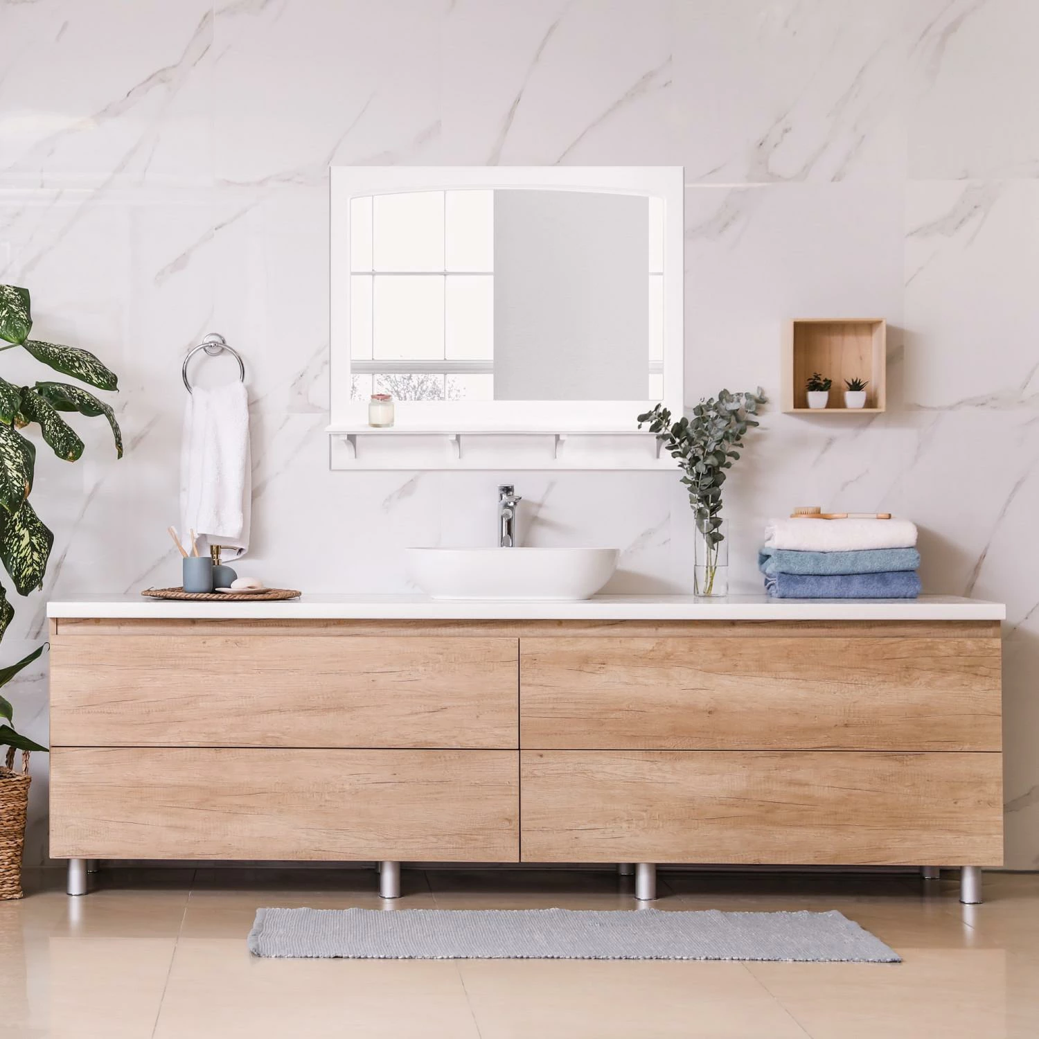 The Design House Concord 37-Inch Rectangle Wooden White Wall Mirror is the essential piece for all of your daily routines. This white wall mount hanging mirror is made of glass and lightweight yet highly durable wood. The mirror is inset within the frame, creating increased depth and dimension to enhance the look of your space. The bathroom mirror features a durable 4-inch shelf to display decorations or store toiletries for easy access. This wall mirror’s minimalist design creates a versatile look you can use as a vanity mirror in bathrooms and bedrooms or as a decorative mirror in entryways, hallways, living rooms, office spaces, hotel rooms, and more. Measuring 37 inches, this traditional decorative mirror is inset within the wooden frame, providing increased depth and dimension that enhances your space. The pine wood frame with a white finish is perfect for farmhouse, contemporary, or traditional decor styles. This accent mirror boasts a fully functional design, which you can use to style empty wall spaces, enhance natural light, and create the illusion of more space. This Shorewood mirror includes mounting hardware for a smooth installation process. It is made of medium density fiberboard backing to be more warp resistant compared to a solid wood backing. Ships to your home in improved packaging, ensuring your mirror gets delivered safely without damage. Customer satisfaction has been our priority for 150 years; this mirror comes with a 1-year limited warranty so you can rest assured your purchase is risk-free. Designed and manufactured by Design House, the trusted source for quality lighting, hardware, plumbing, kitchen, and bath products for every taste and budget.