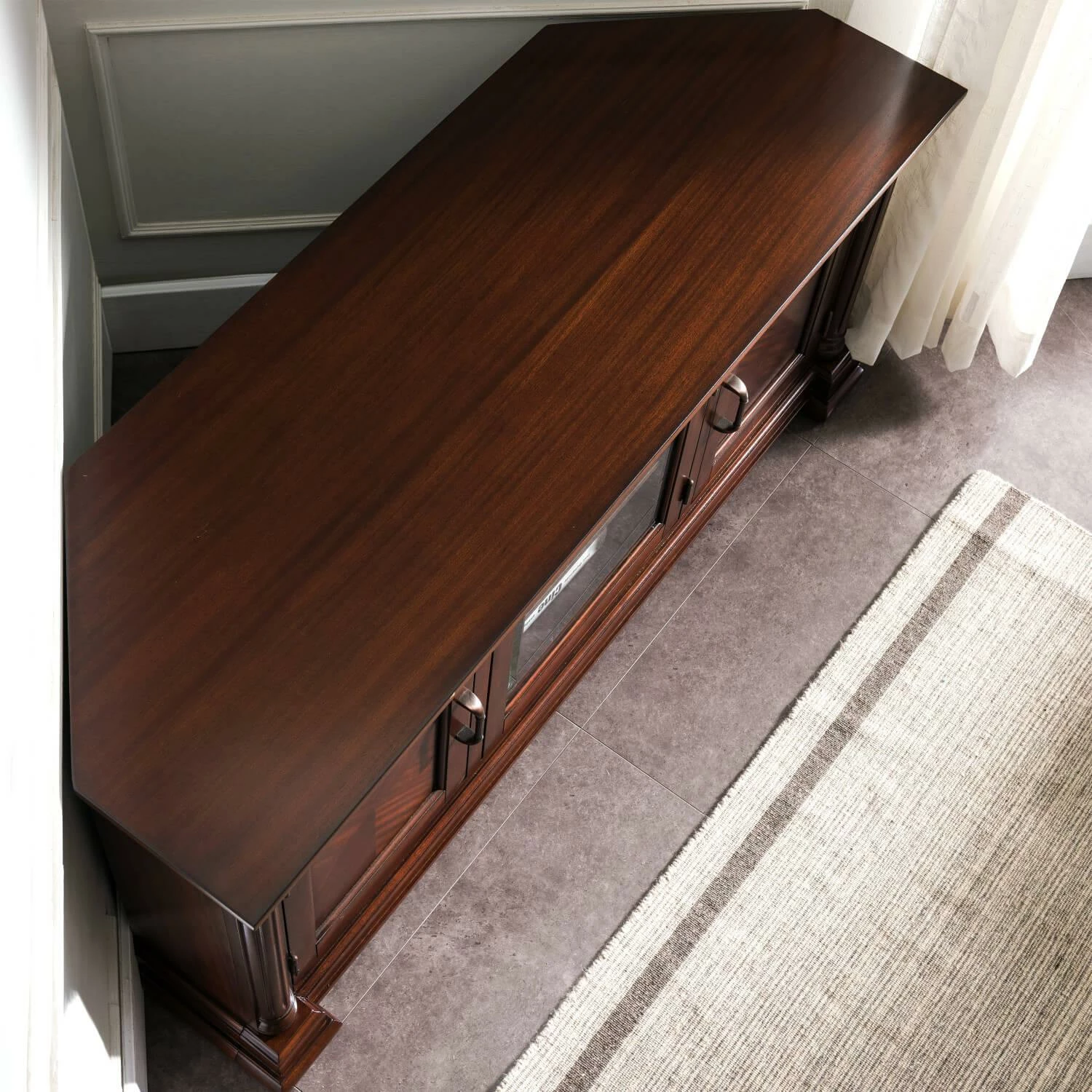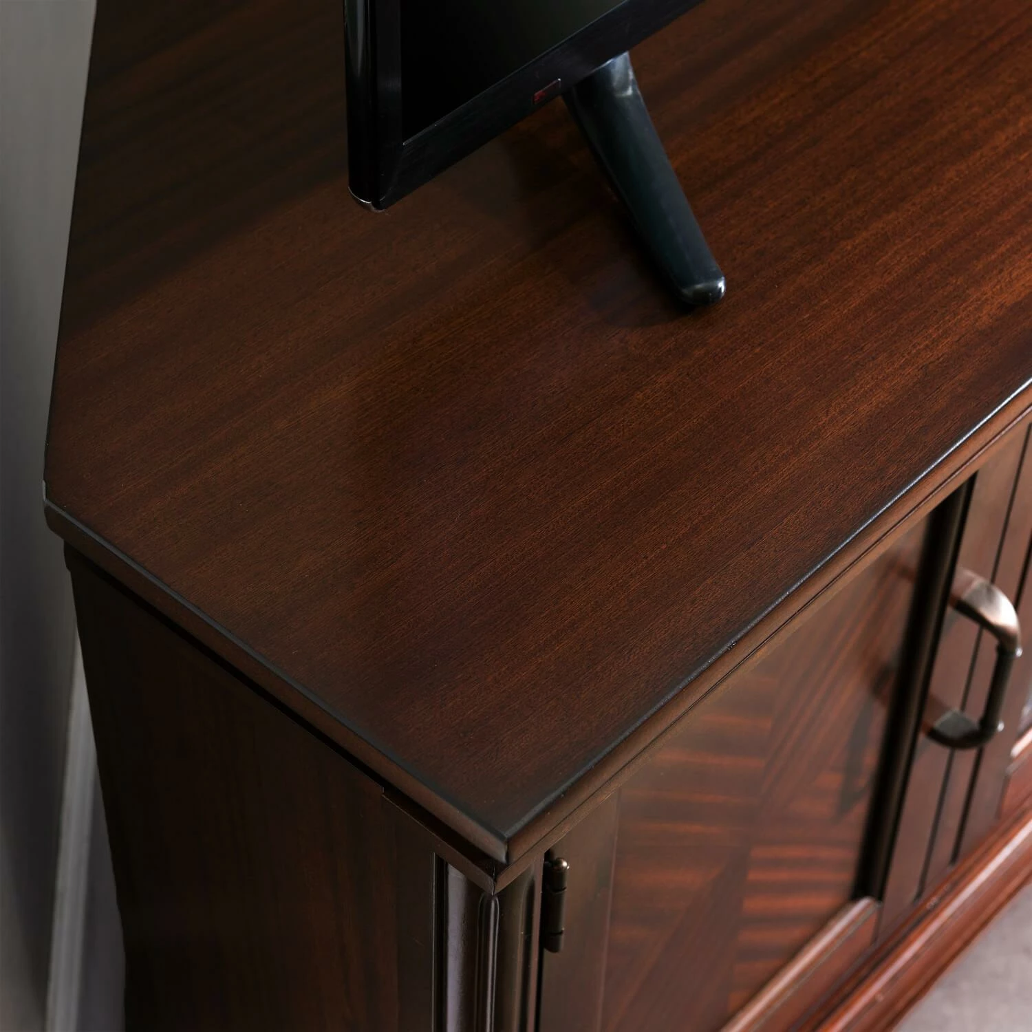 Sustainable American Hardwoods are complemented with bookmatched mahogany veneers in this dressed up tradtional beauty. Reeded split turnings, Moulded elements beneath the top, sturdy base components, tinted beveled glass…are bejeweled with glinting bronze antiqued hardware. Enclosed side storage keeps things tidy, while the center door keep electronics dust-free behind infrared remote friendly tinted glass. The center door springs open with just a touch of the unique touch catch. Designed and manufactured by Leick Home, the trusted source for quality home furnishings for every taste and budget.