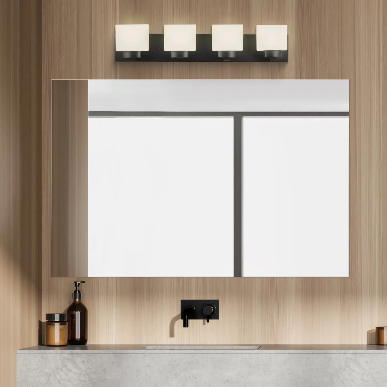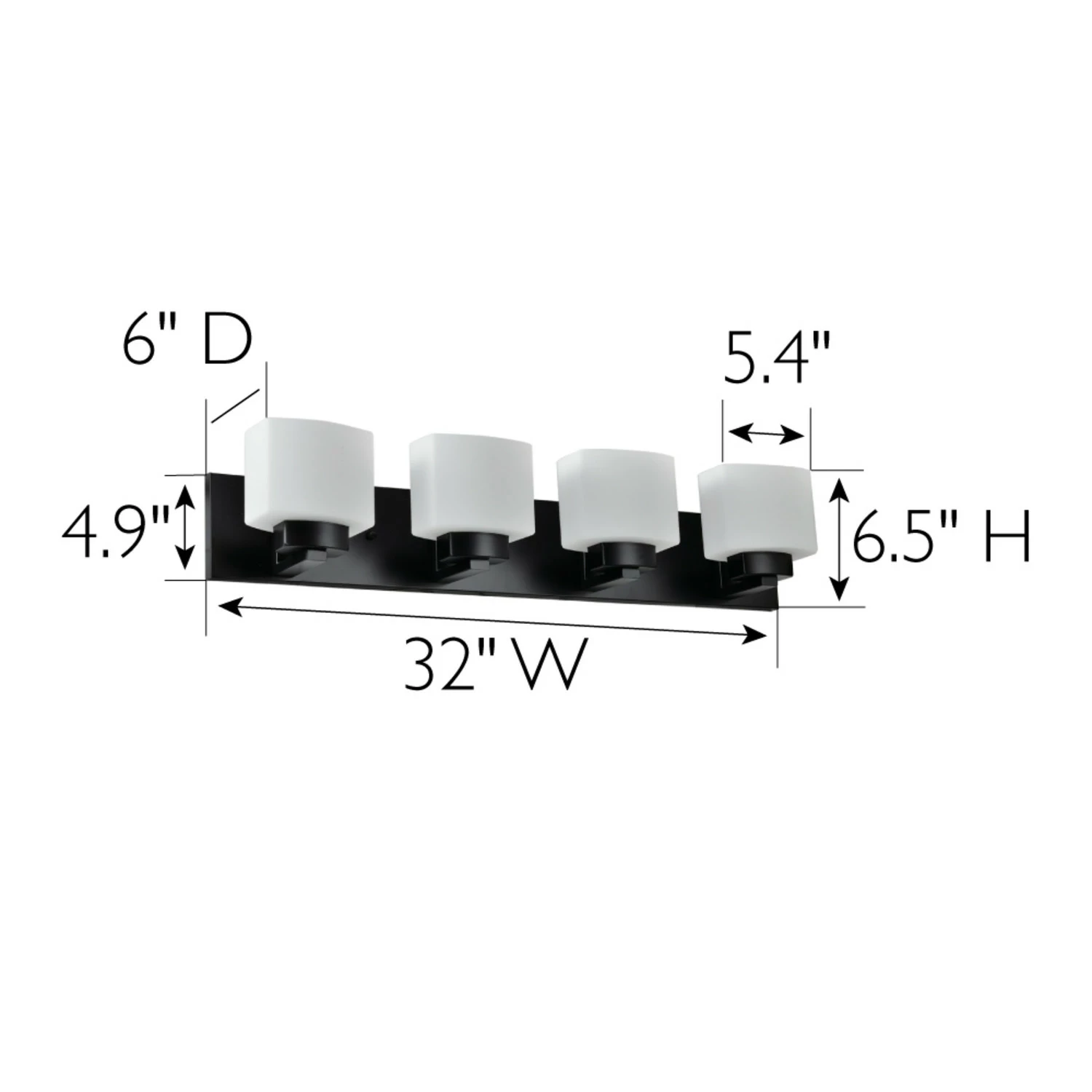 - Four Light Vanity Light: Uses four 60-watt medium base bulbs or LED equivalent (not included)