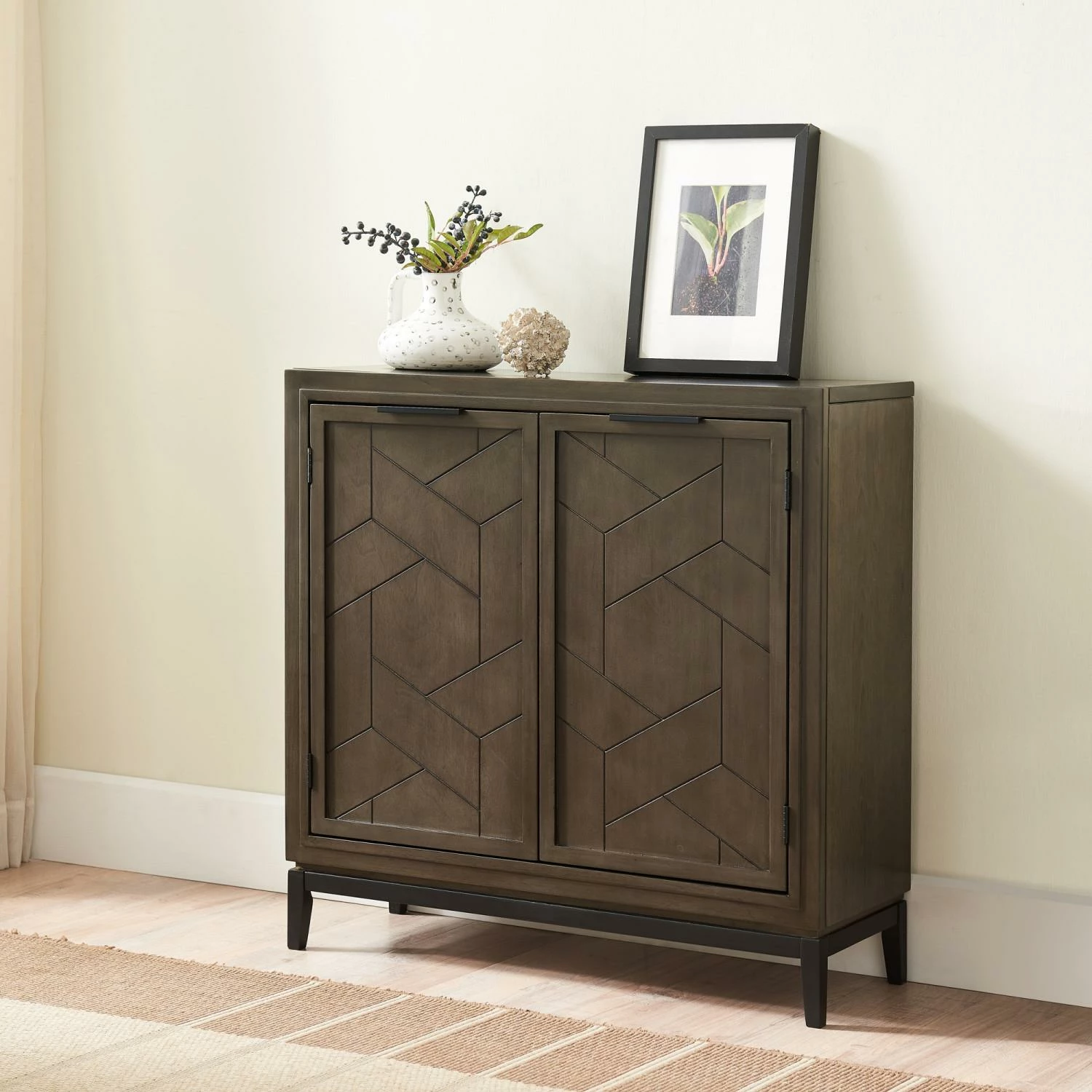 A matte black metalwork base provides the perfect foundation to the Emmett Foyer Cabinet. Geometric surface textures are called out against a rich, riverstone finish with a refined edge pull at the top of each door. Compactly scaled to accommodate smaller spaces, this lovely cabinet delivers enclosed storage behind two doors, with the added versatility afforded by an adjustable interior shelf. Designed and manufactured by Leick Home, the trusted source for quality home furnishings for every taste and budget.