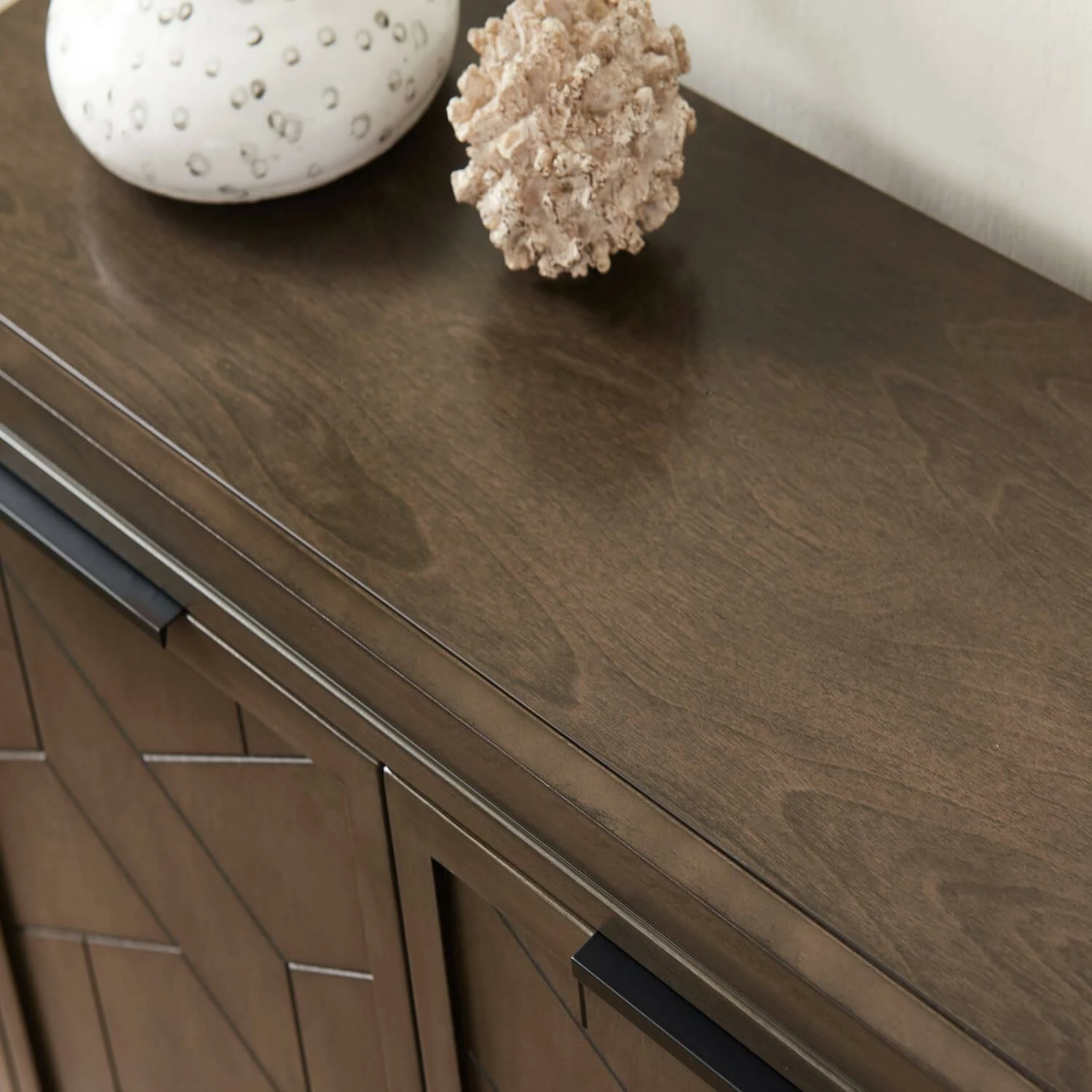 - Geometric surface texture door treatment with refined edge door pulls