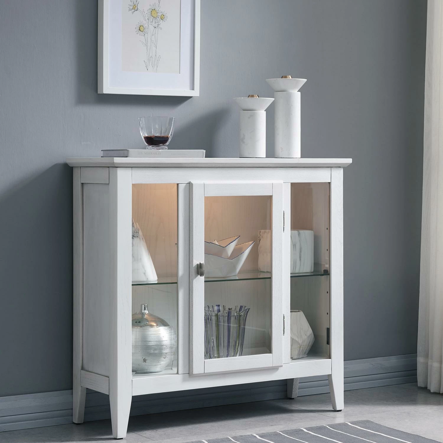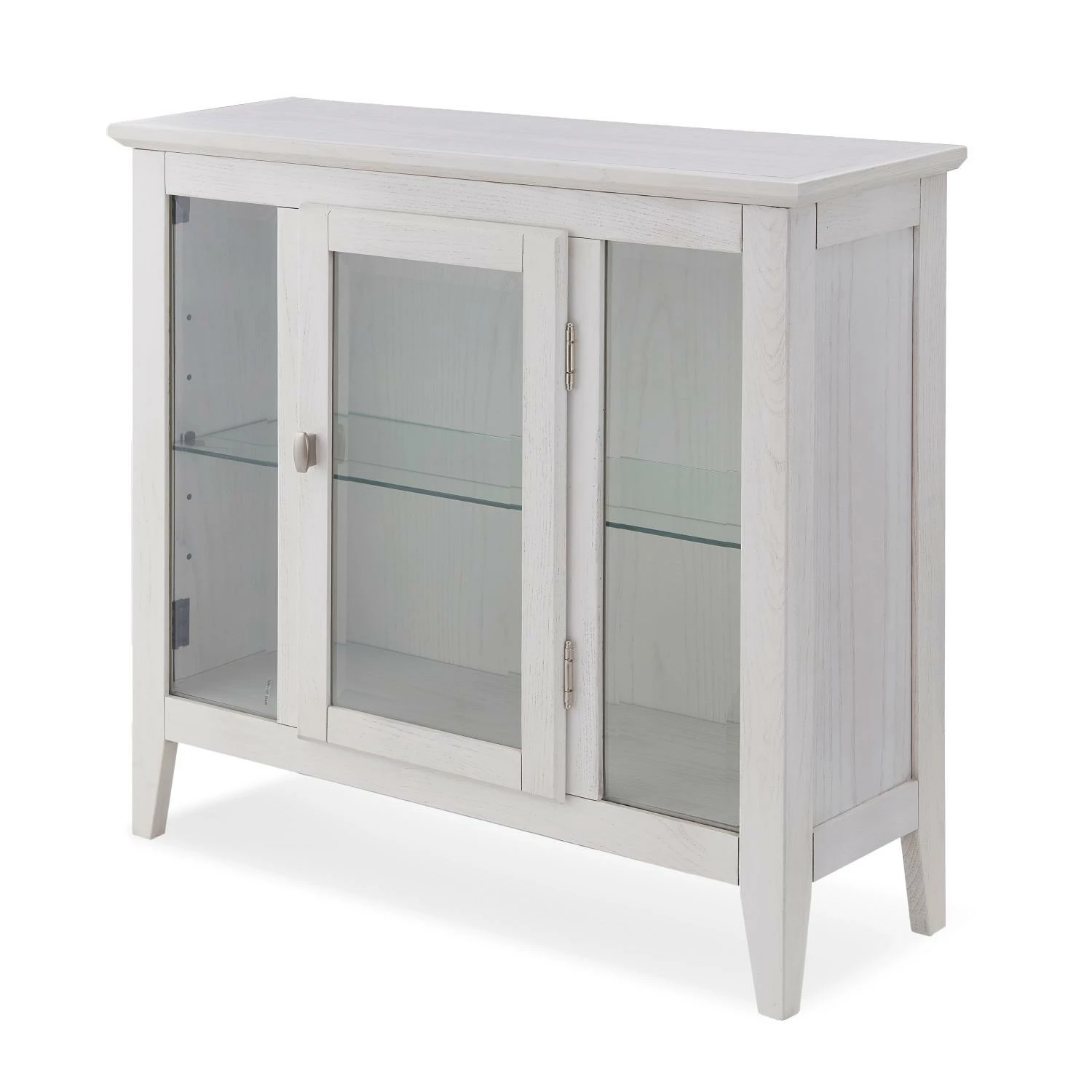 Perfectly scaled for entryways in apartments, condos and other smaller spaces, this lighted display cabinet brings ambiance and style to any space. Clean design lines are adaptable and styled to join existing furnishings. like beveled glass, an adjustable shelf, nickel hardware, and a weathered white, painted finish all adorn this space-saving curio cabinet. Designed and manufactured by Leick Home, the trusted source for quality home furnishings for every taste and budget.