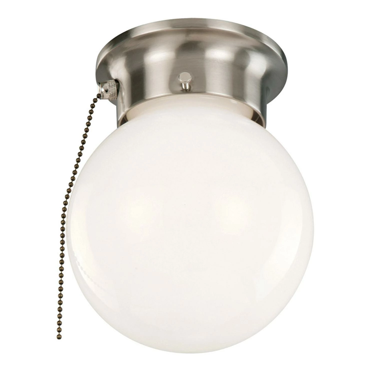 - Traditional flush mount ceiling light has a modern satin nickel finish and round opal glass shade