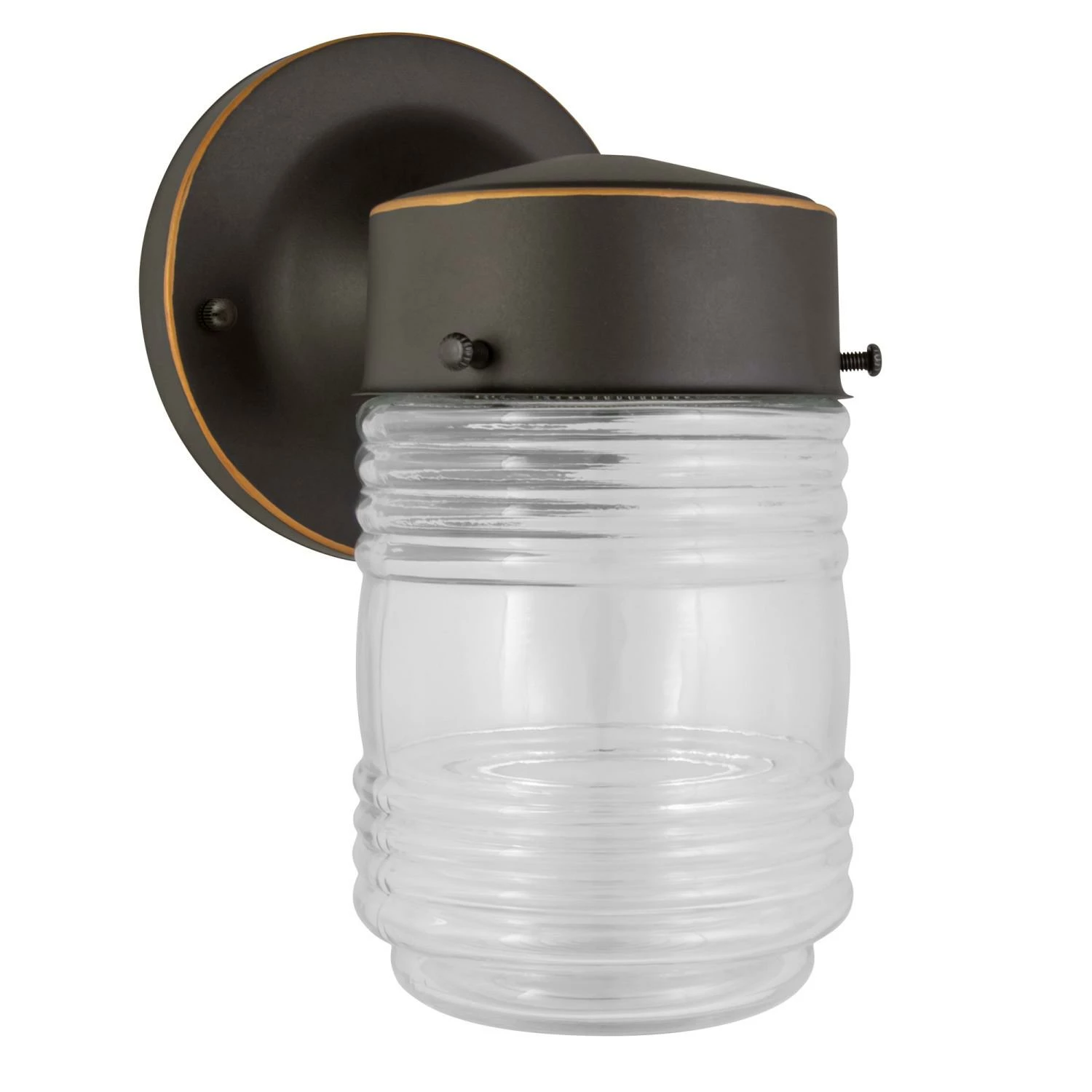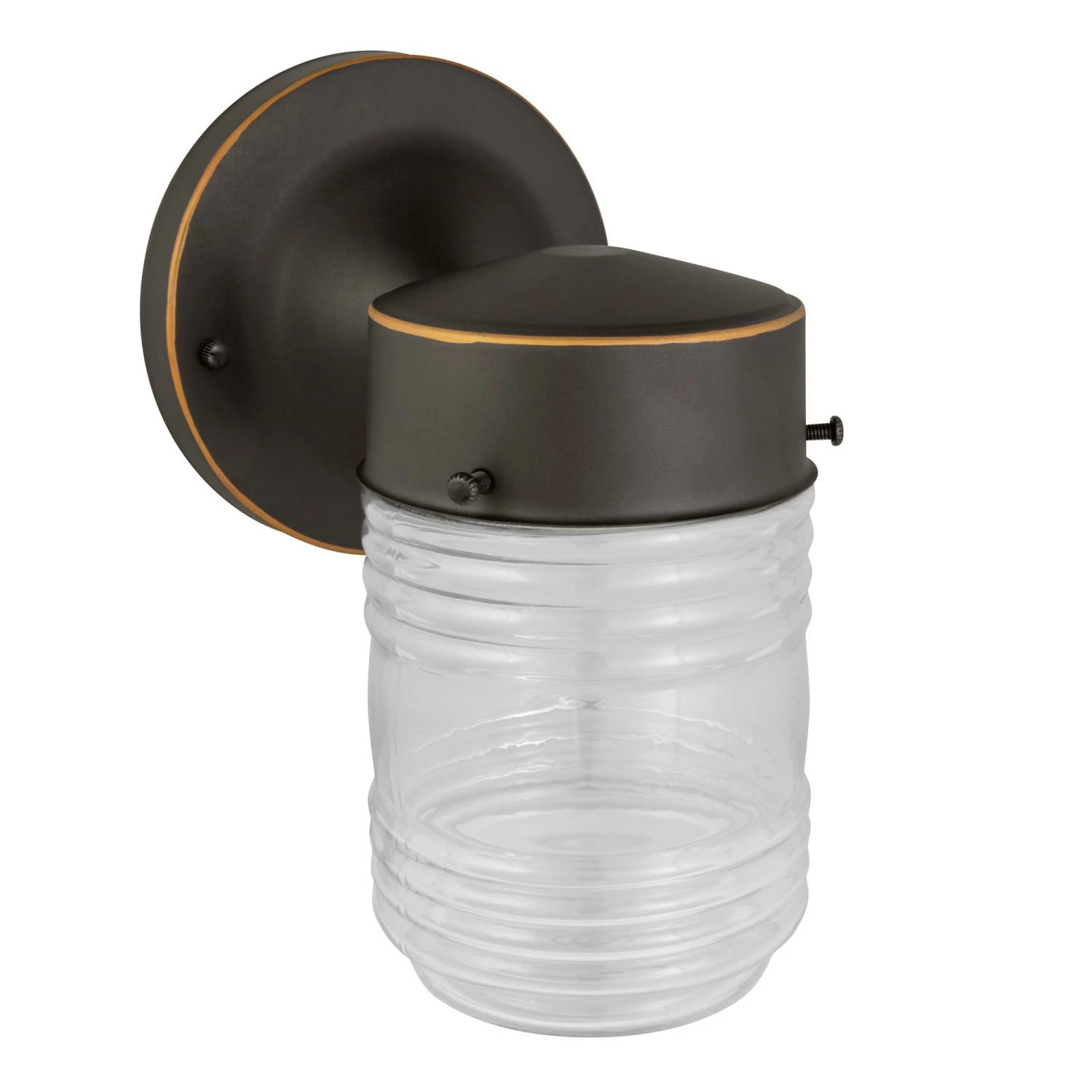 The Design House Jelly Jar Indoor/Outdoor LED Wall Light features a oil rubbed bronze finish, clear glass and a rustic design. This light glows like a…