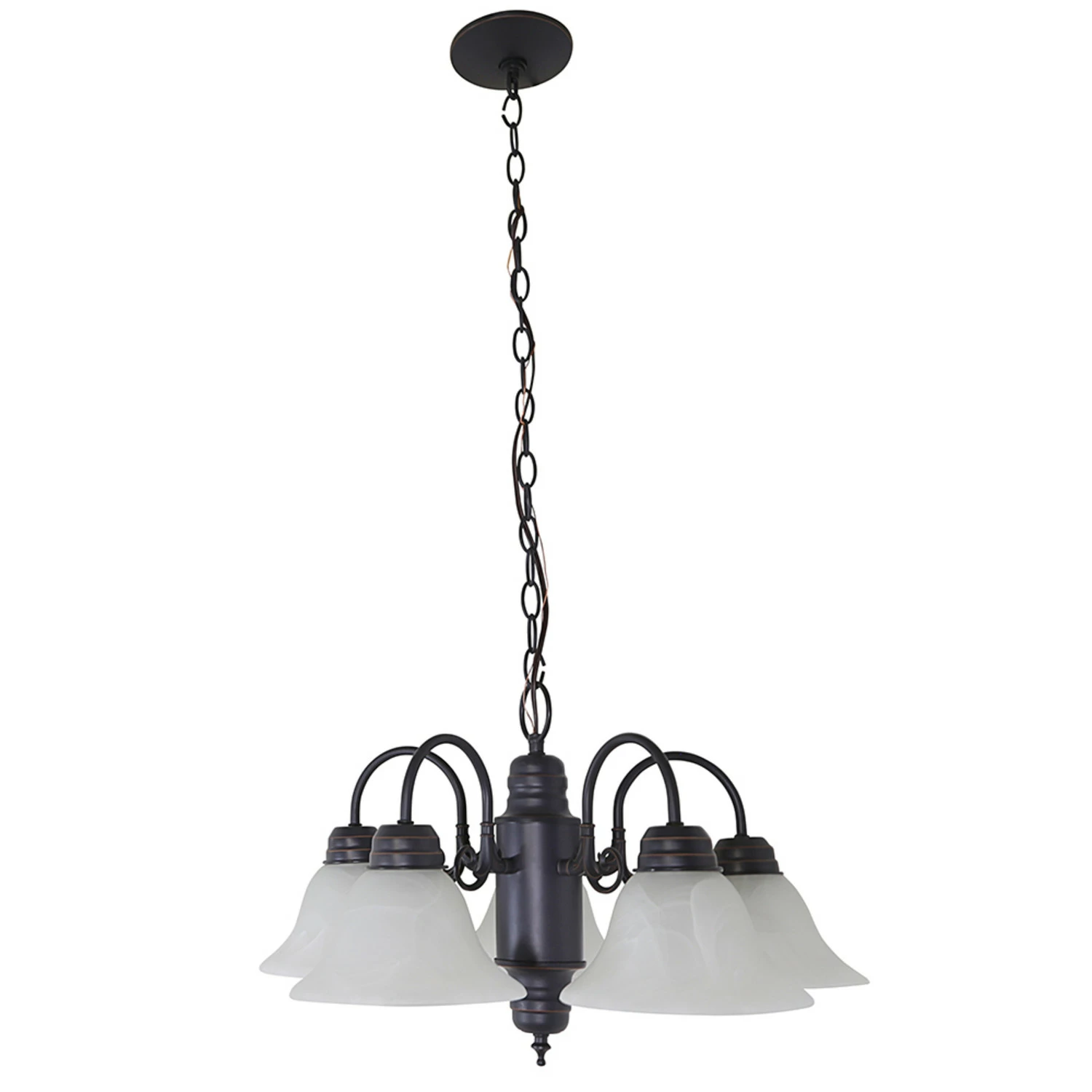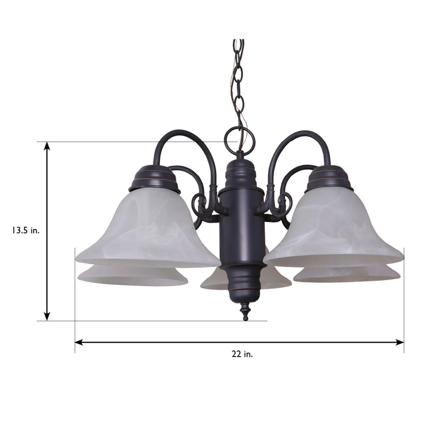 - Traditional chandelier has a rich oil rubbed bronze finish and bell-shaped alabaster glass shades