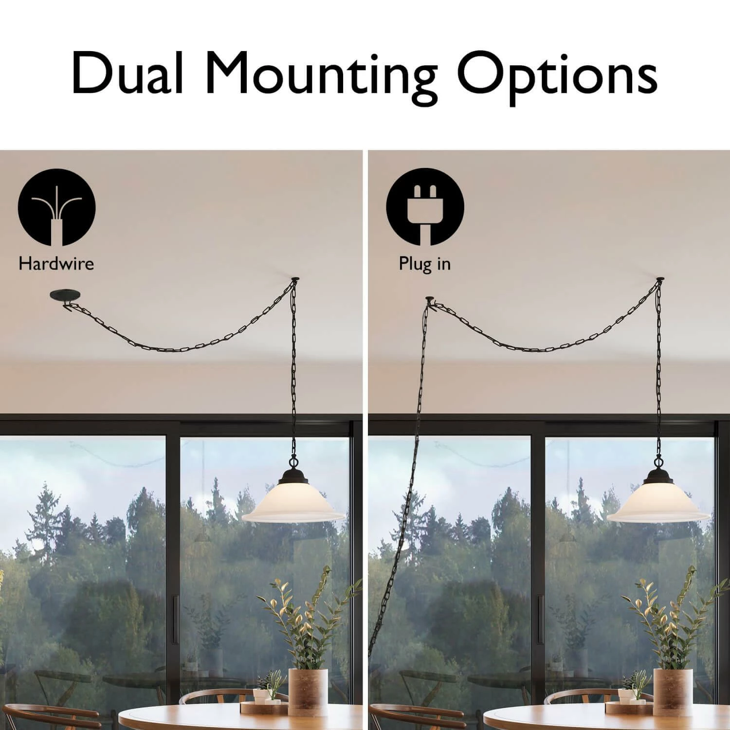 - Mobile traditional hanging swag light has an oil rubbed bronze finish with an alabaster bell shade