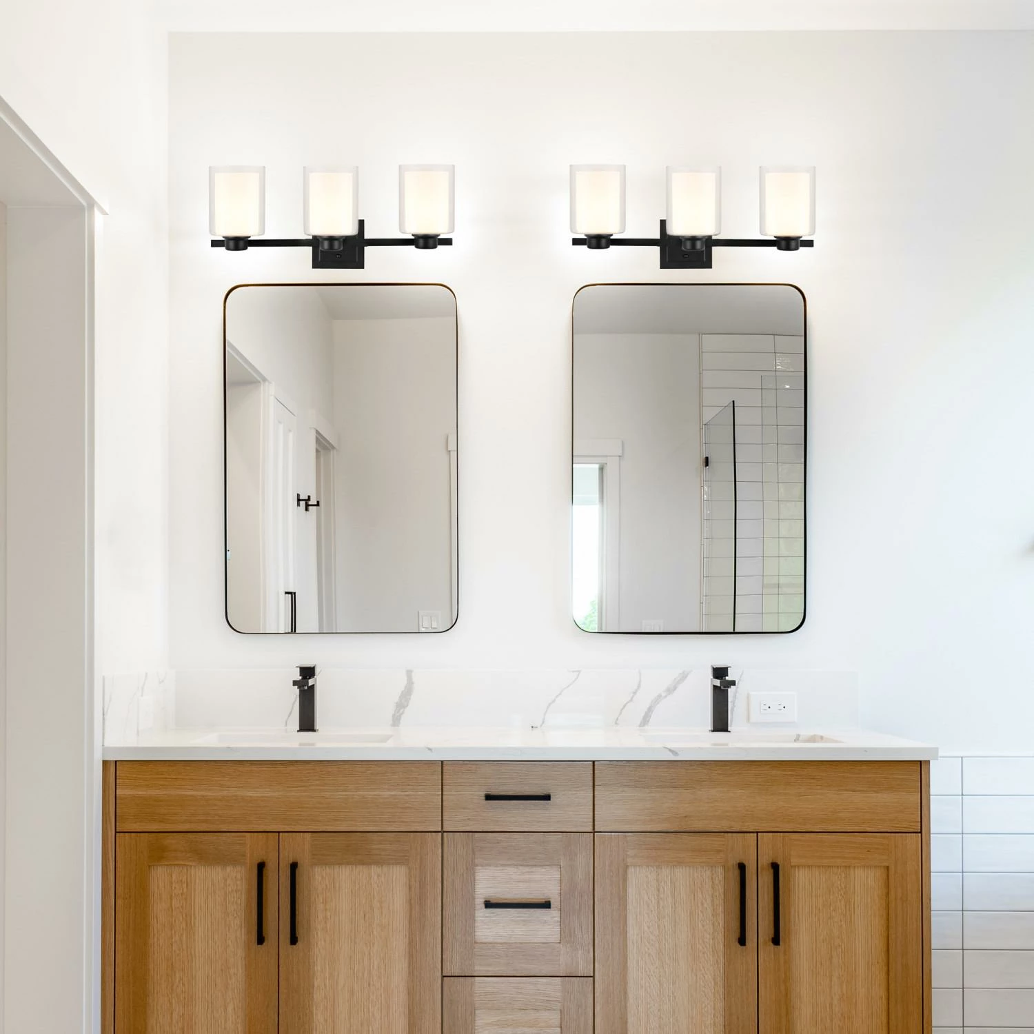 With dual cylinder glass shades and matte black finish, the Design House 556159-BLK Transitional Oslo 3 Light wall light will work with both tradition…
