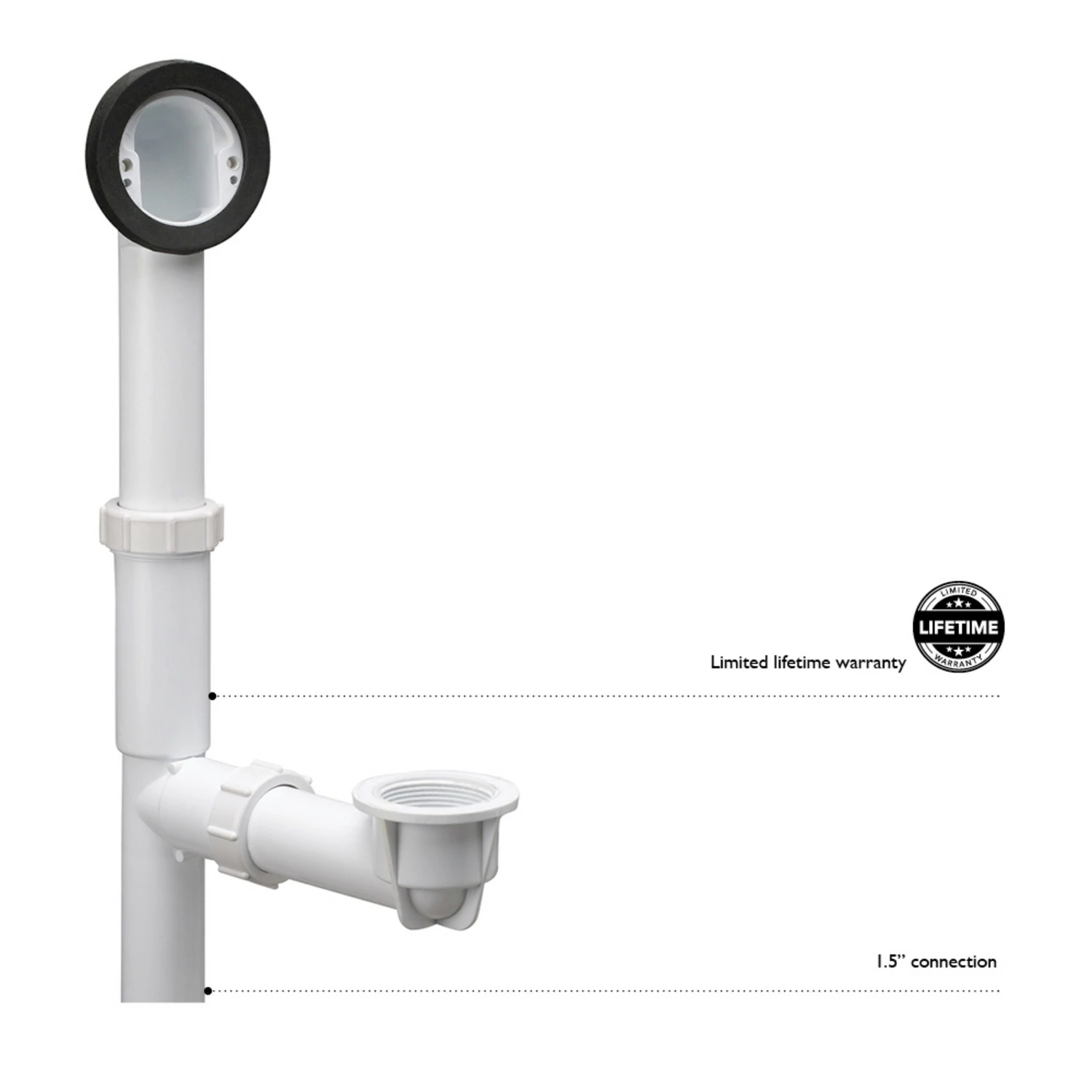 The Design House PVC Bath Drain Rough-In Kit completes the bath drain replacement using the lift & turn or toe tap drains. Constructed of plastic and rubber, this kit requires a 1.5-inch connection. The height can be adjusted between 15.95 inches to 19.3 inches from the base of the PVC pipe and drain depth can be adjusted between 8 inch and 9.1 inches from the vertical pipe. Designed and manufactured by Design House, the trusted source for quality lighting, hardware, plumbing, kitchen, and bath products for every taste and budget.
