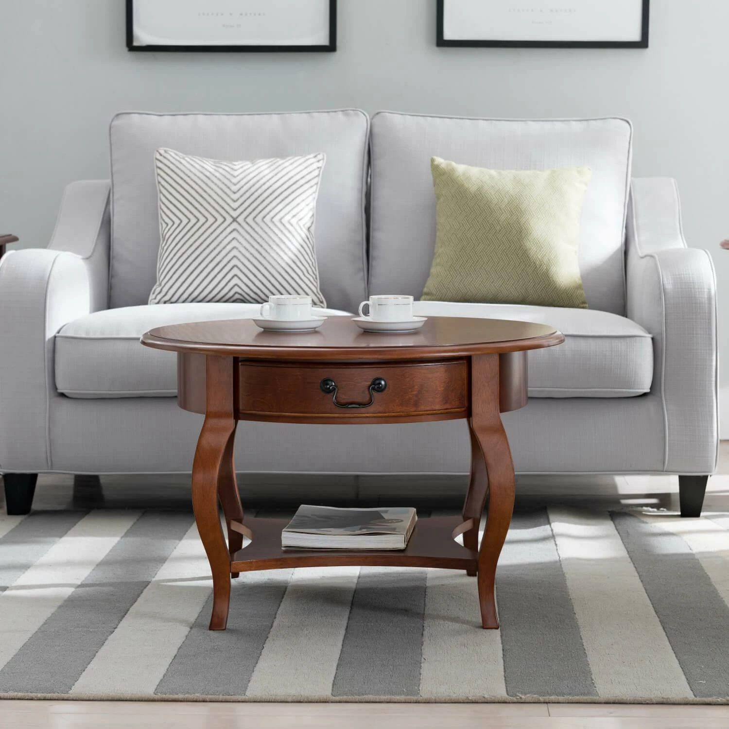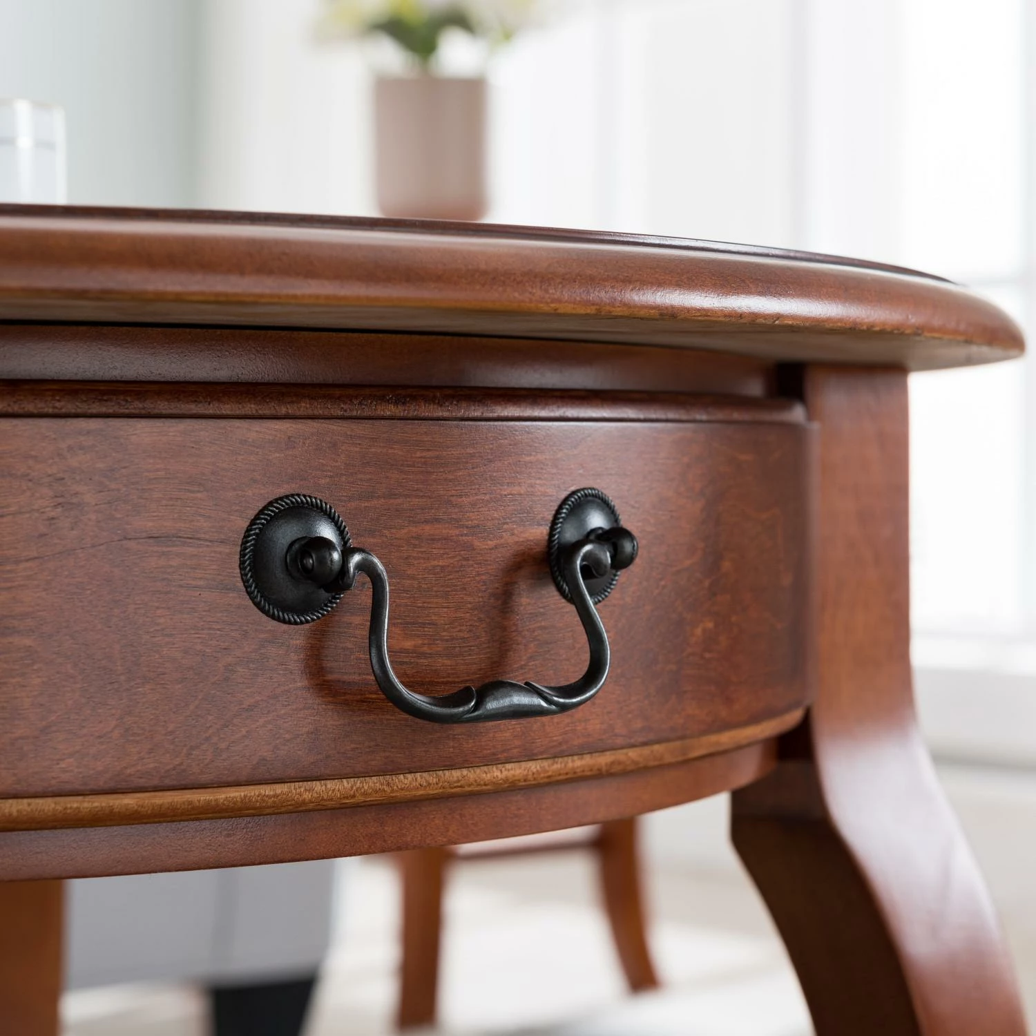 Graceful cabriole legs and a soft, brown cherry finish bring the French countryside indoors in this compact coffee table. Drawer storage and plentiful…