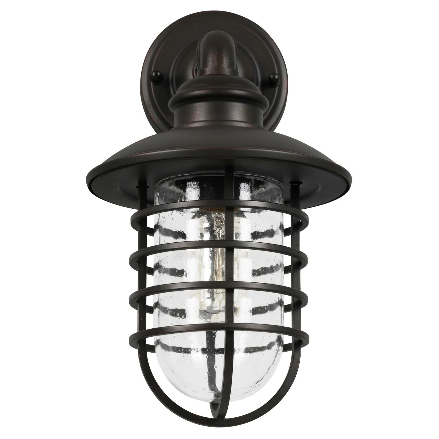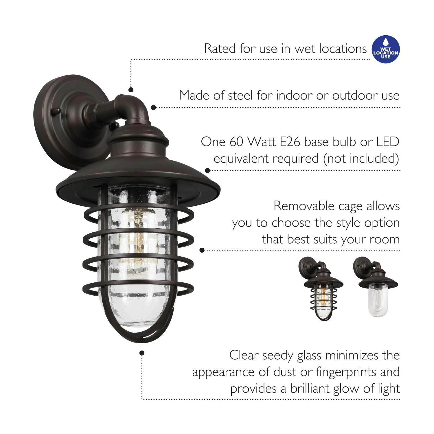 - Ideal for Indoor and outdoor use, this rustic industrial inspired wall light has a bronze finish, removeable metal wire cage shade and Clear, seedy glass