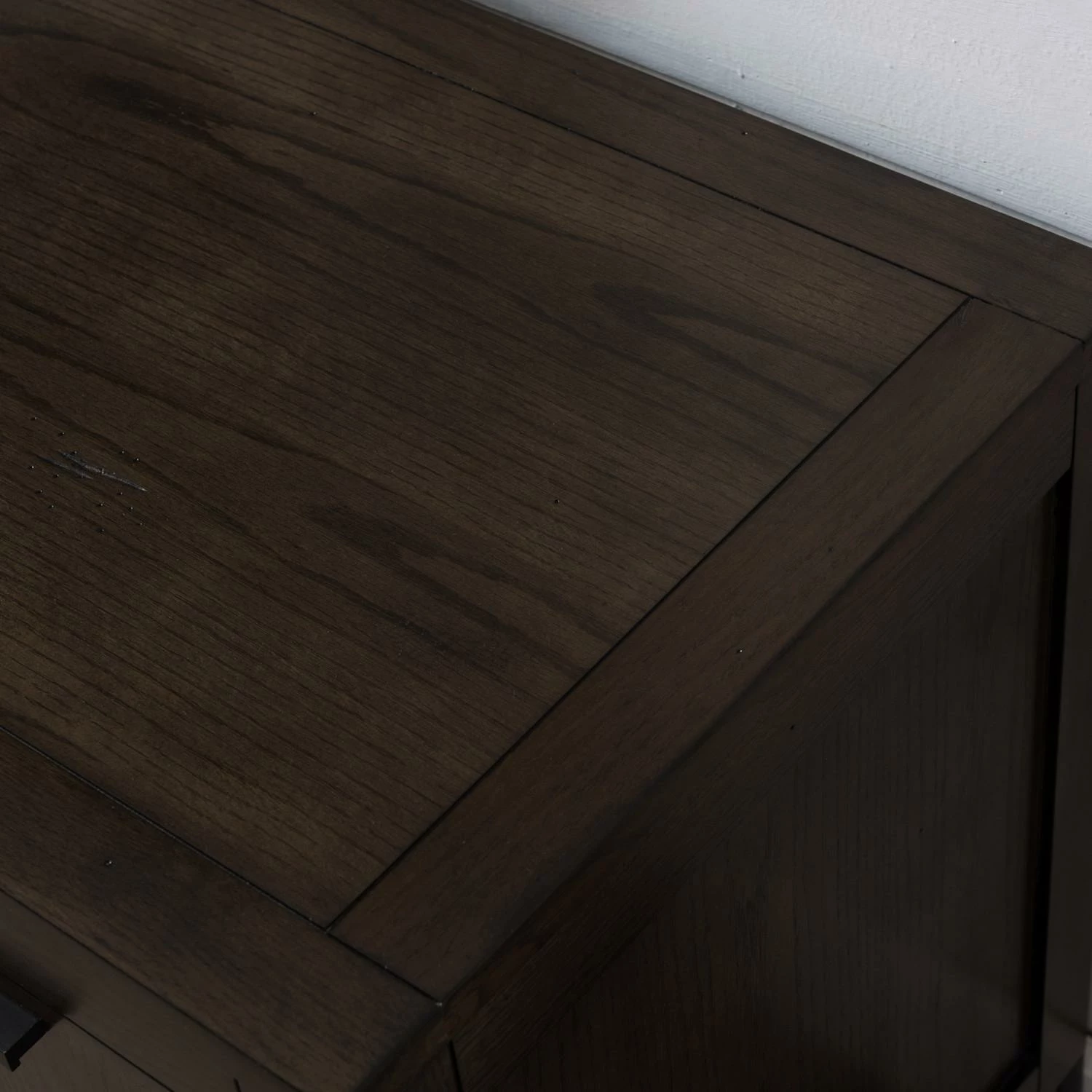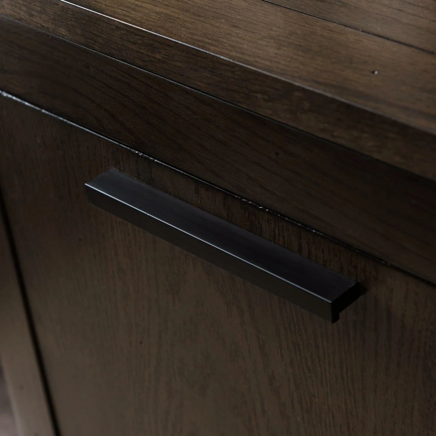 - Distressed Riverstone finish with matte Black door hardware