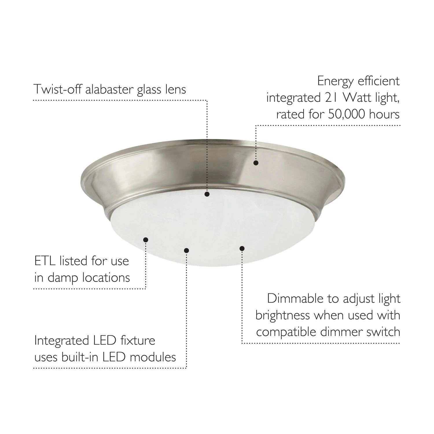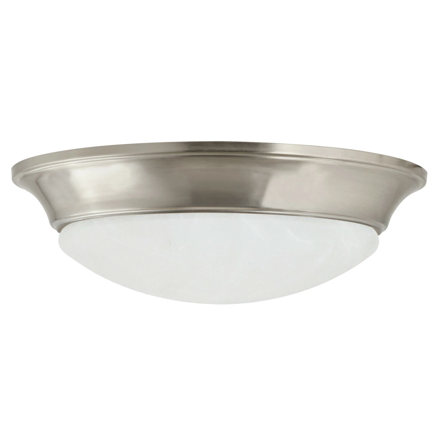 - LOW PROFILE round flush Mount ceiling light has a metal trim in a satin nickel finish with an alabaster domed glass lens that easily twists on/off
