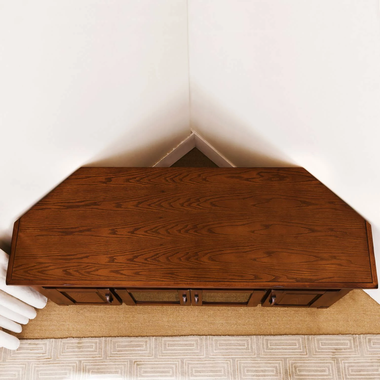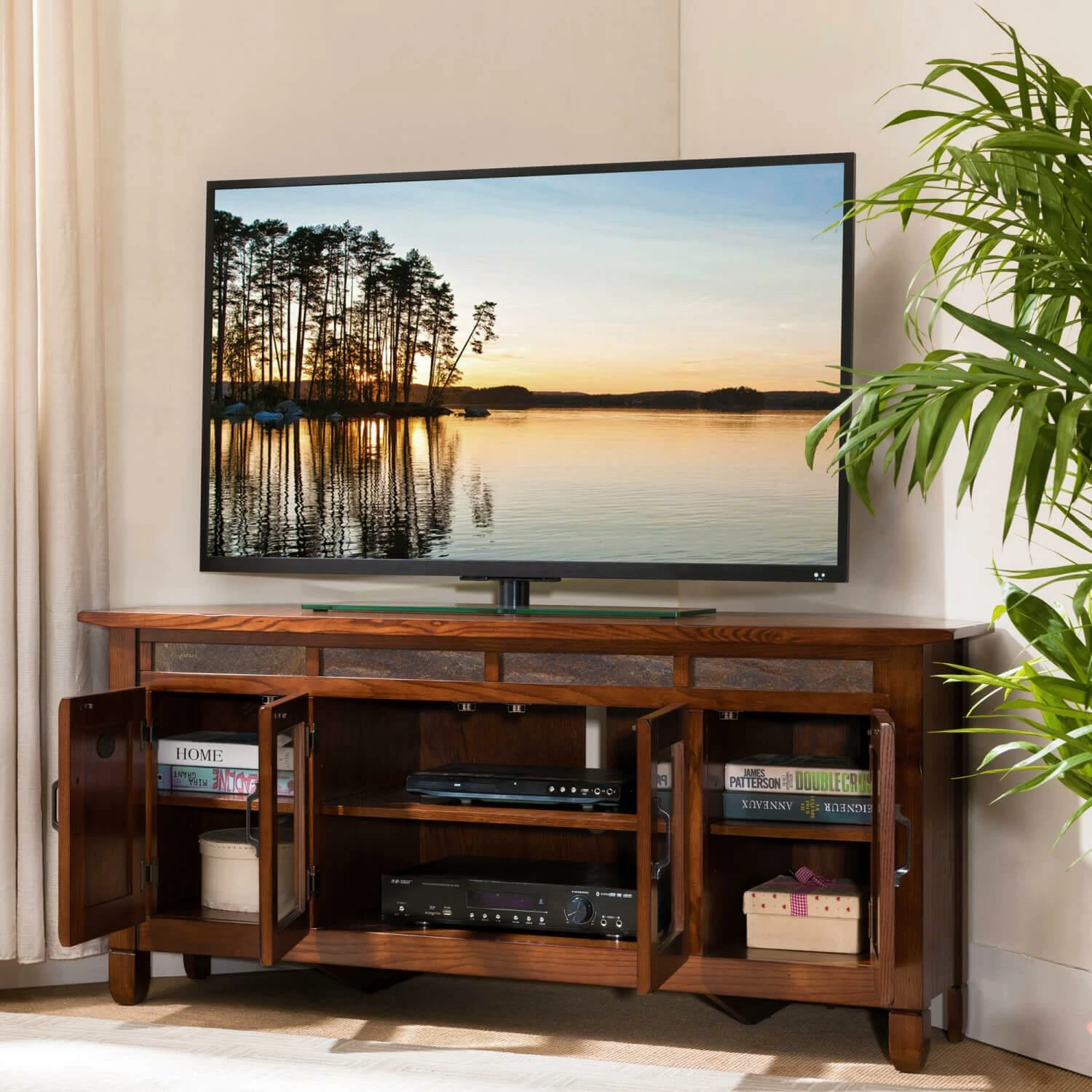 This sturdy oak Corner TV Console will hold TVs up to 62inch with surface area to accomodate a sound bar or surround speakers. Running slate tile deta…
