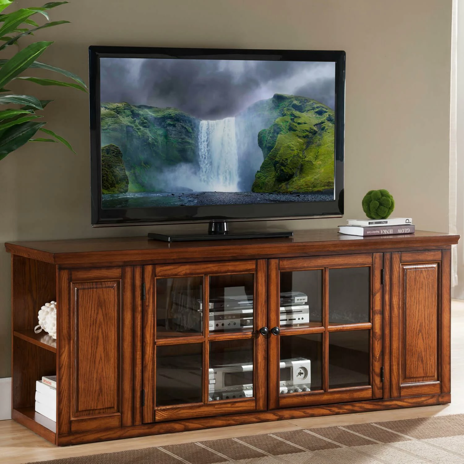 This 62-inch Leick Home 88162 Burnished Oak TV Stand holds TVs up to 60 inches and tames CDfoots/DVDfoots/gaming equipment into a buttoned-up and orde…