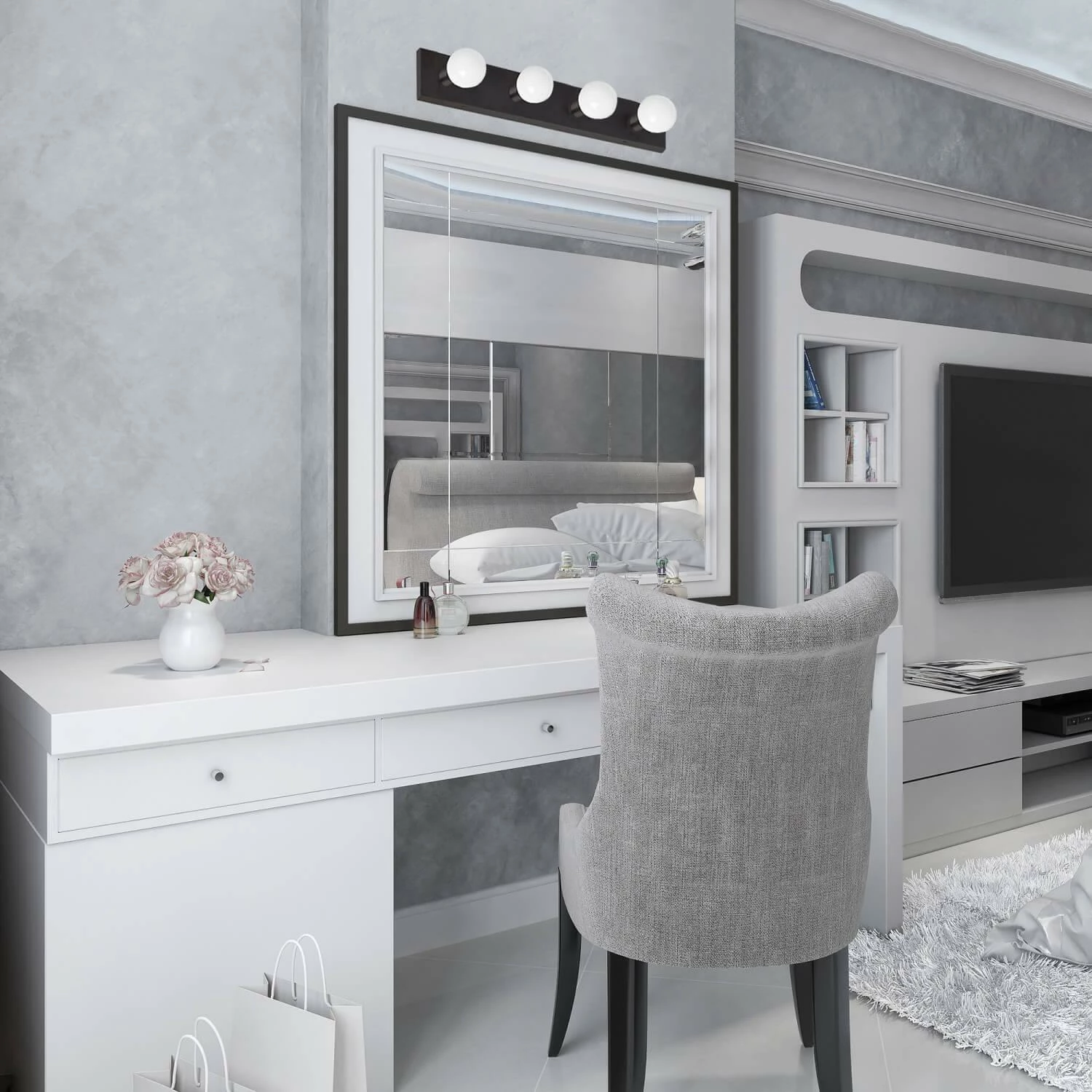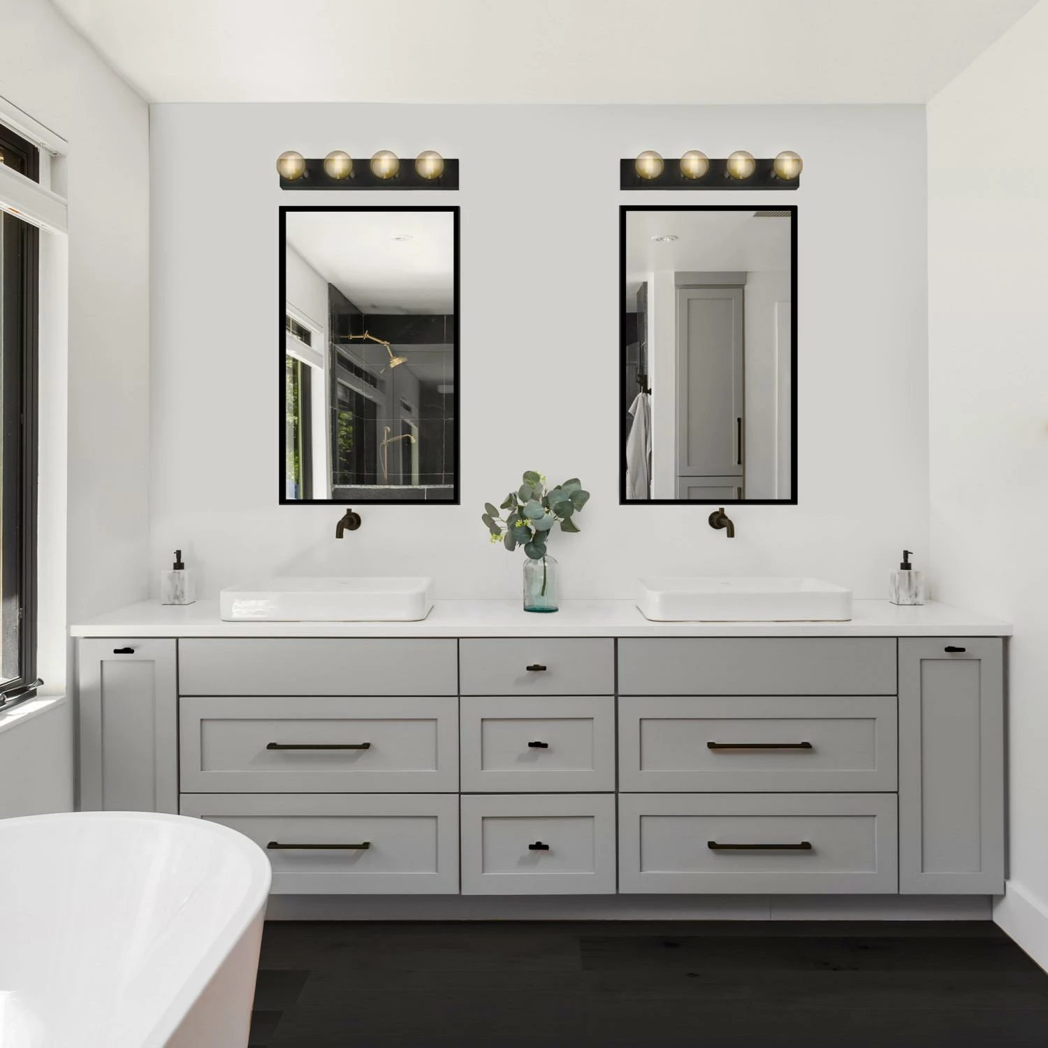 - Four Light Vanity Light: Uses four 60-watt medium base bulbs or LED equivalent (not included)