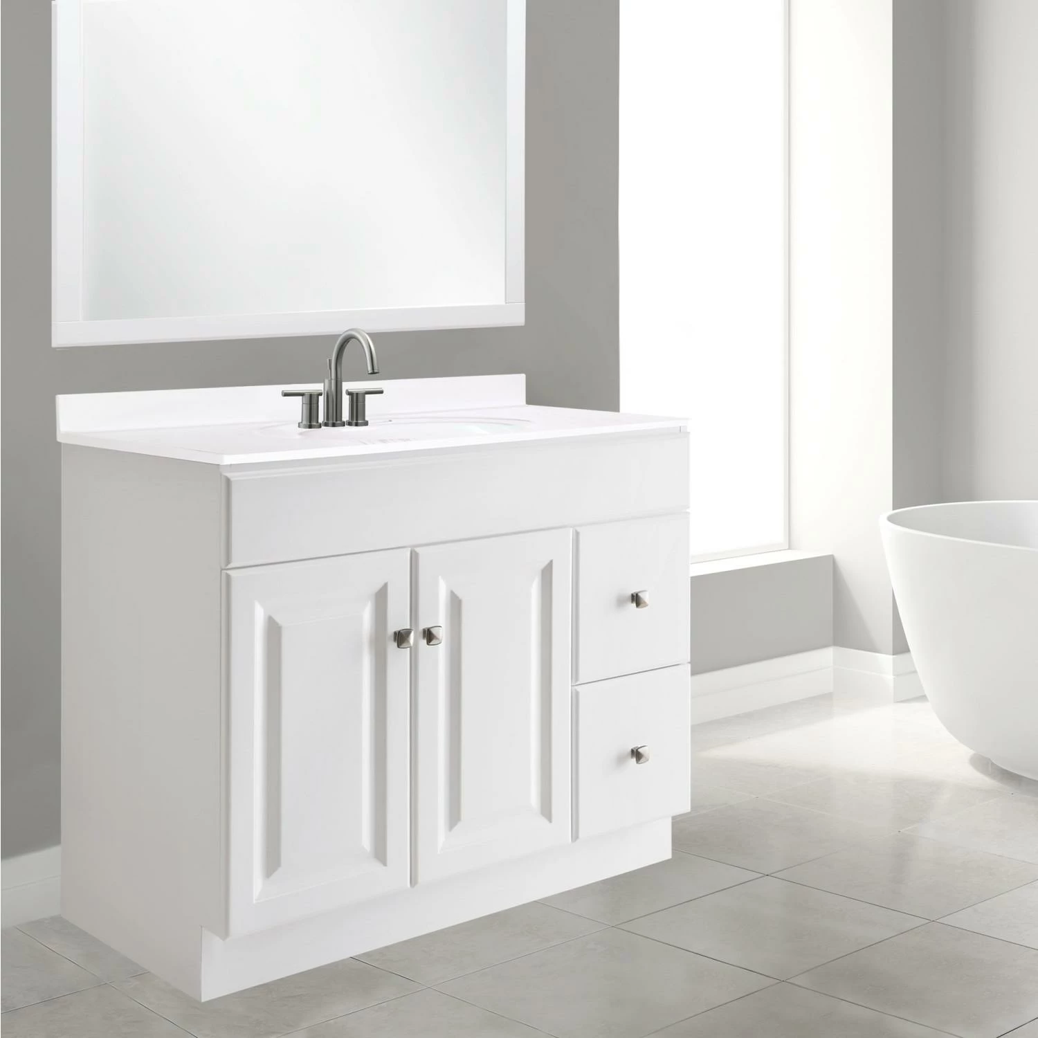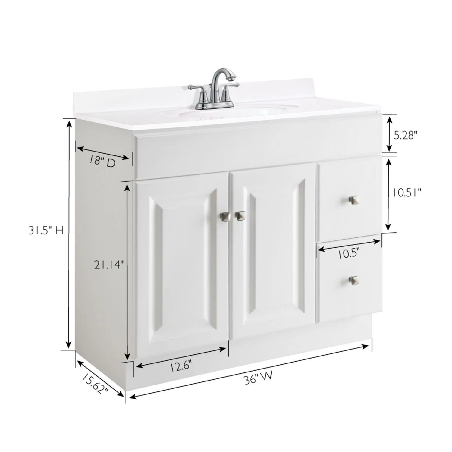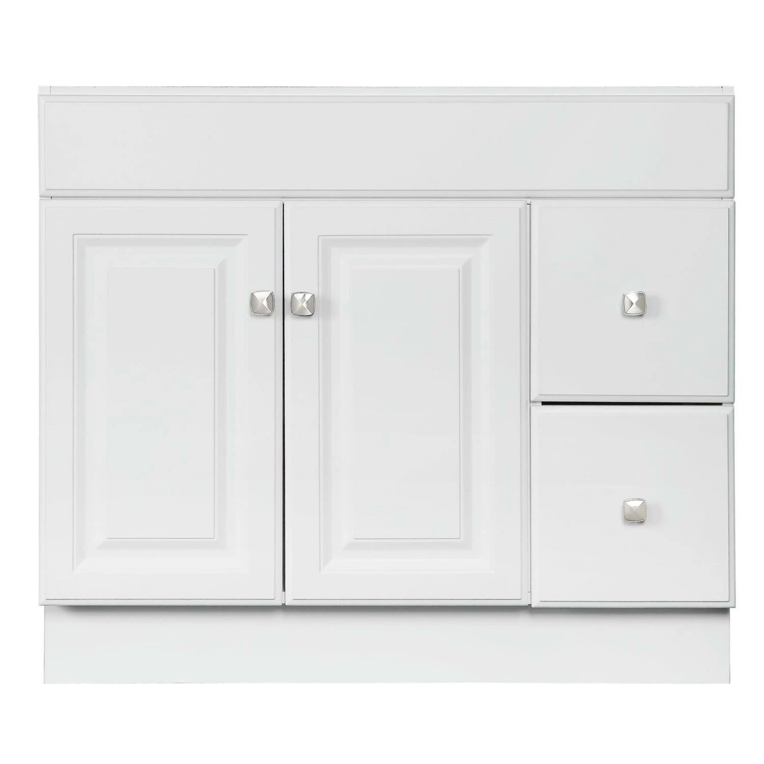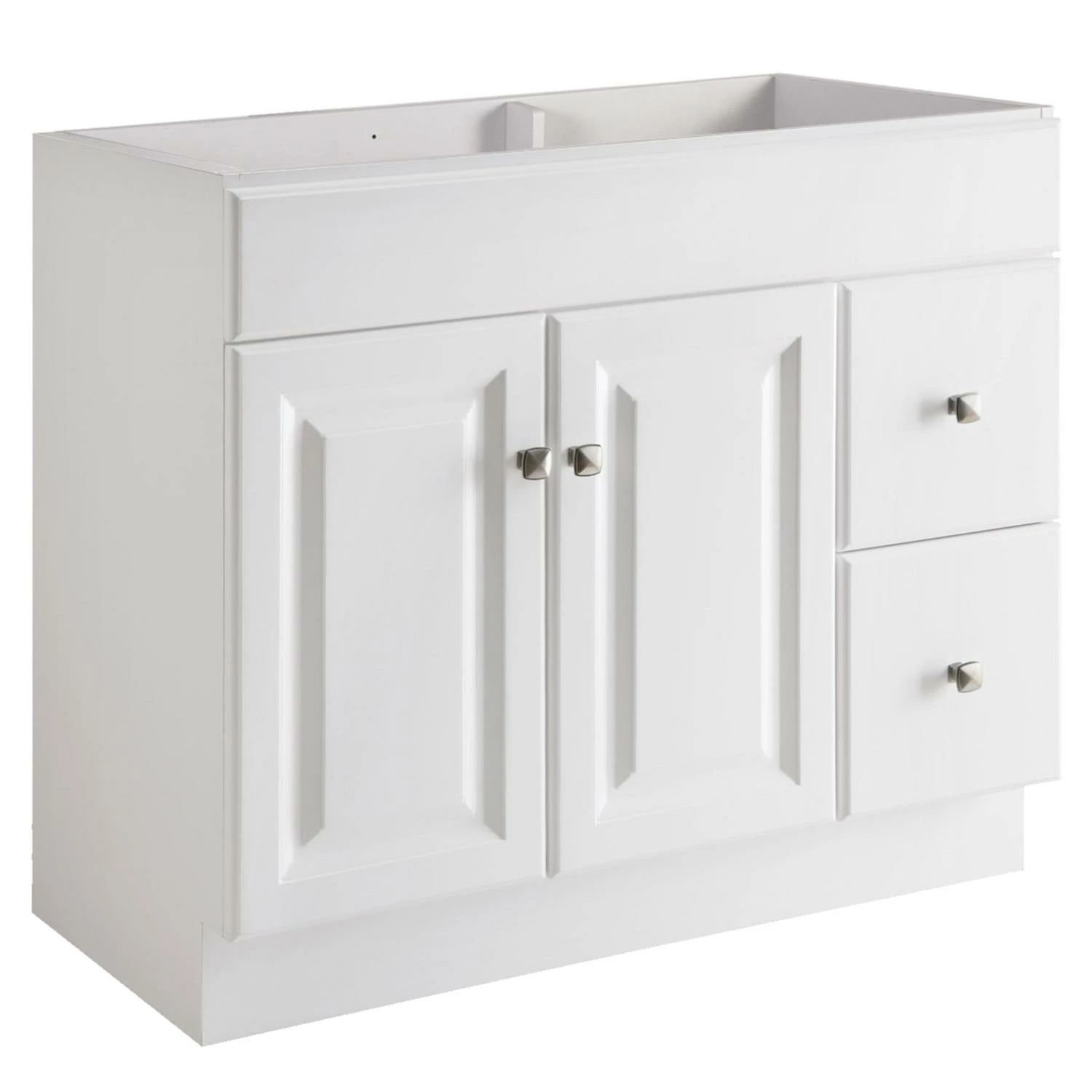 The Design House Wyndham Unassembled Vanity Without Top features a durable white finish and satin nickel knob hardware. Perfect for any style home, this vanity has clean lines and concealed hinges. The 2-door, 2-drawer construction gives you plenty of storage for toiletries to keep your countertop free of clutter. Easily add an additional shelf inside this cabinet for even more storage. Measuring 36inch by 18inch by 31.5inch, this vanity can fit into any small or medium-sized bathroom while still providing ample storage space. Traditional construction meshes with subtle modern details to quickly brighten up your bathroom. This product is perfect for remodeling your bathroom and matches granite countertops and colored walls.