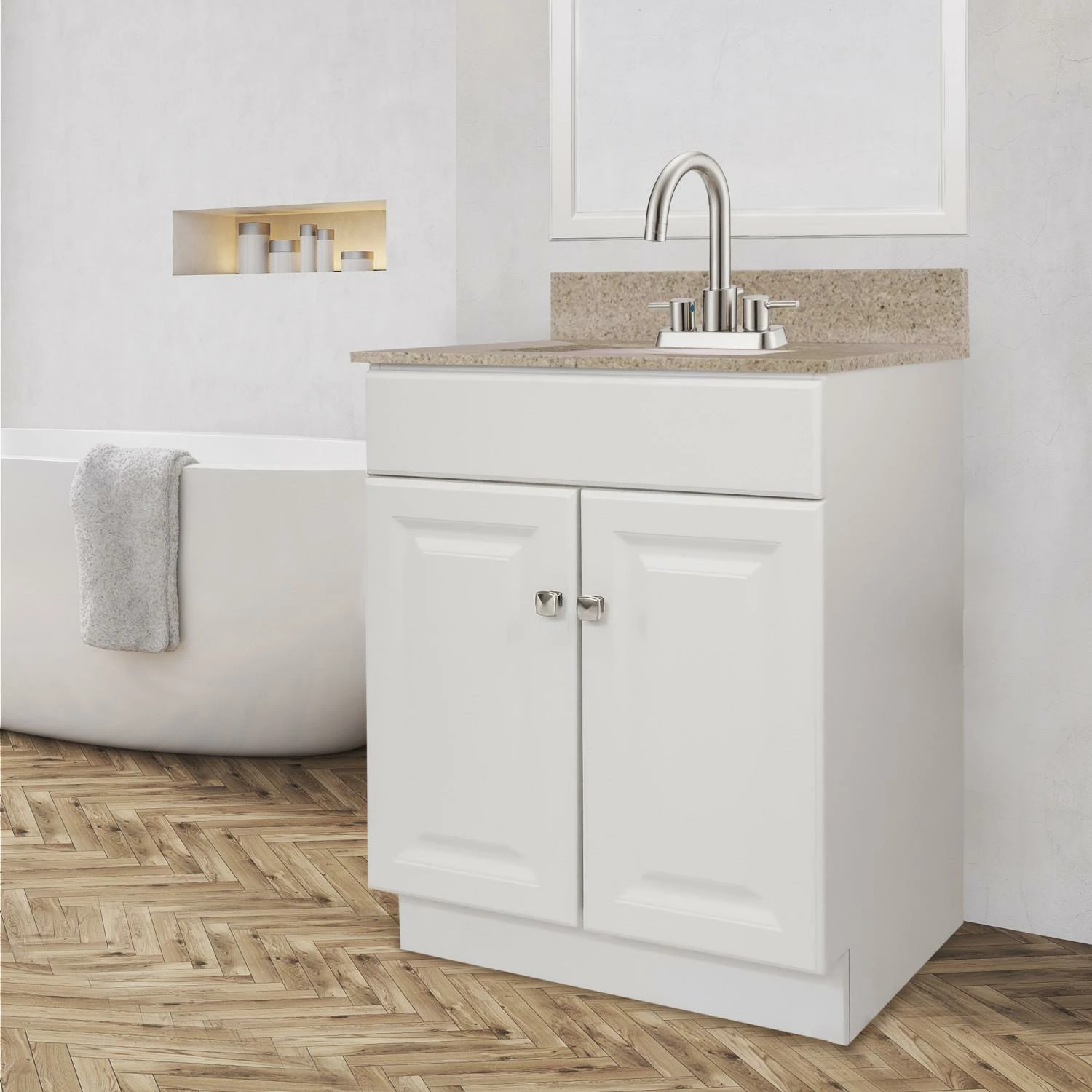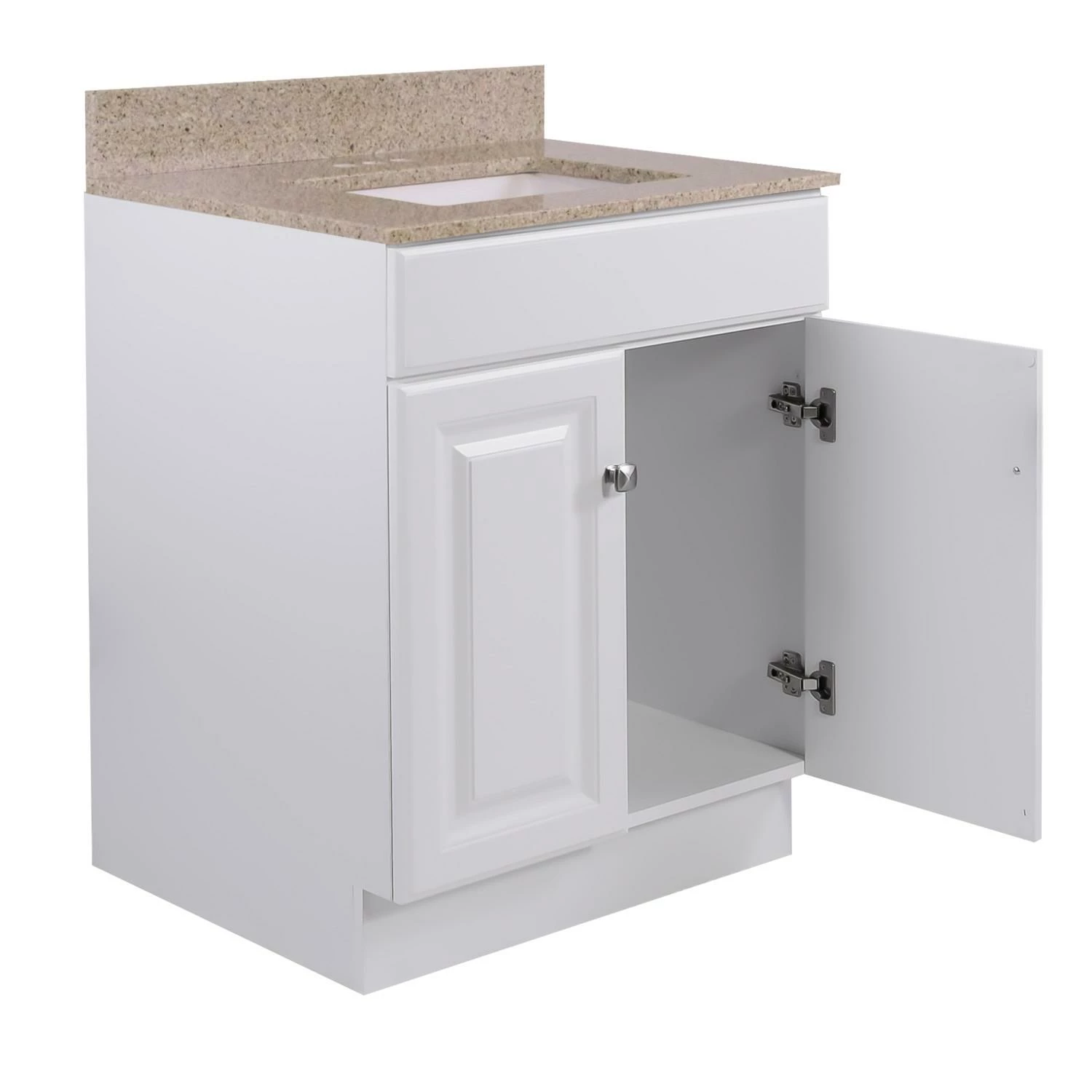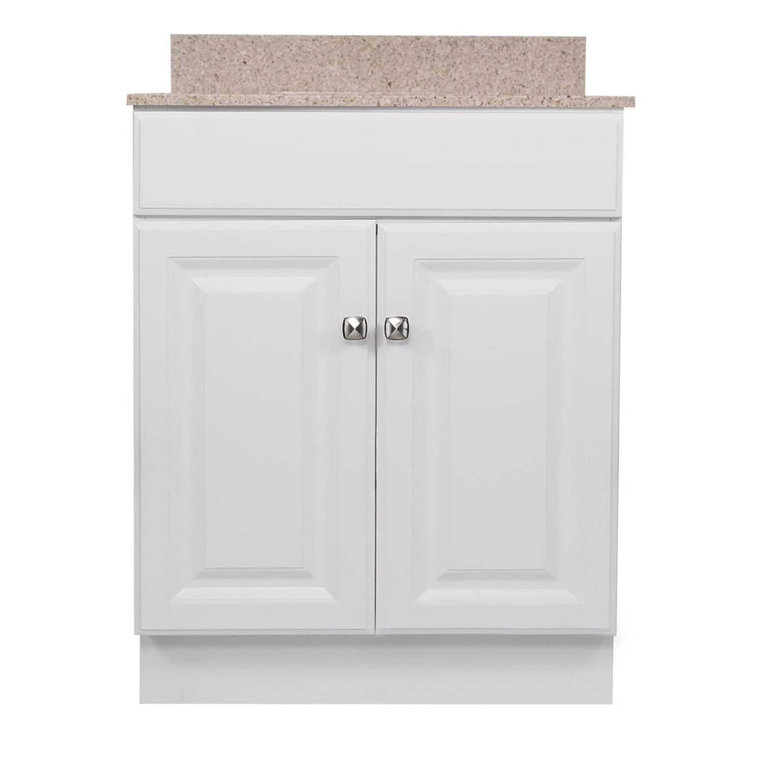 The Design House 25-inch Wyndham bathroom vanity set makes an elegant storage solution for any country style home. Timeless simplicity at its best, this piece presents clean lines for a classic look and a durable white semi-gloss finish with satin nickel knobs for easy access. Features include 2-door construction with a frameless design for enhanced storage space, keeping your toiletries tucked away and countertop free of clutter. The Wyndham vanity is stylishly paired with a golden sand granite top speckled with a rich blend of beige, white and brown, creating a subtle contrast with the crisp white base and providing long-lasting durability for years to come. A rectangular, white ceramic undermount bowls sits flush inside. One overflow hole and three 4-inch straight holes are pre-drilled to install your faucet and a backplash is included to help prevent water damage. This countertop’s squared edges add a modern design to appeal to contemporary tastes. The vanity base comes unassembled. The Design House 25-inch Wyndham bathroom vanity set has a 1-year limited warranty that protects against defects in materials and workmanship.
