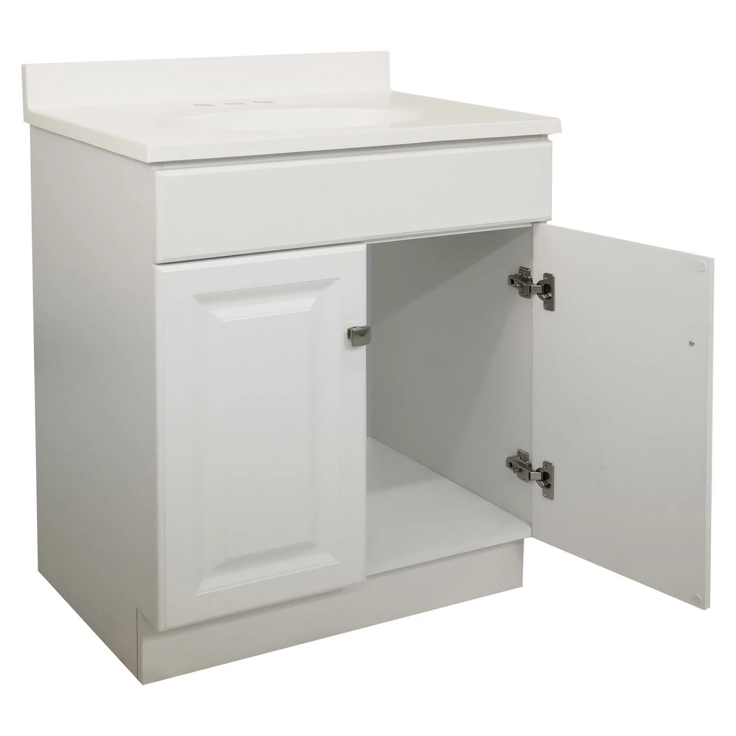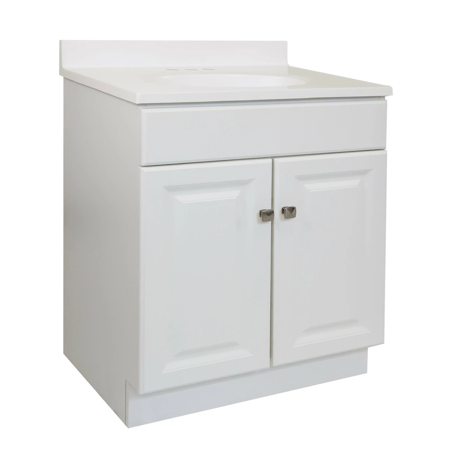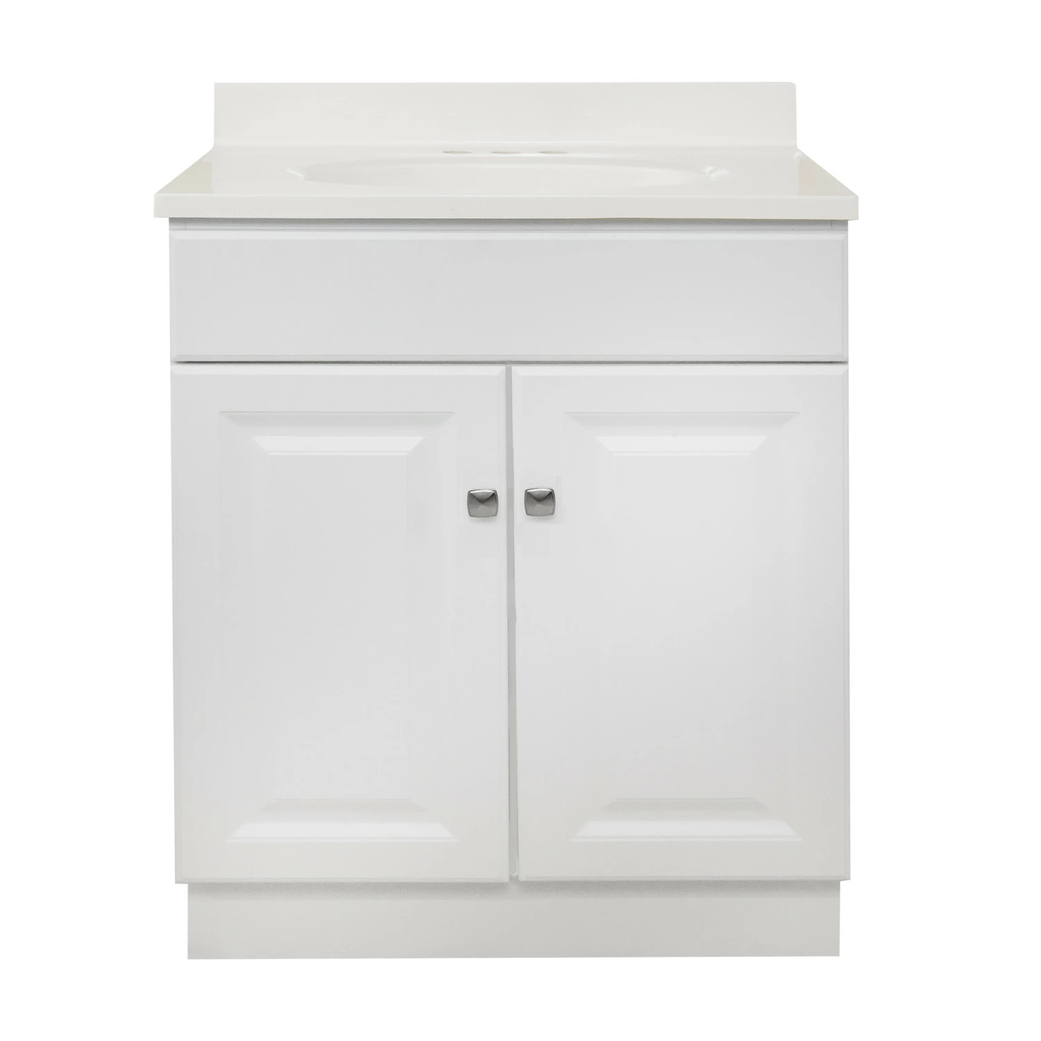 The Design House 31-inch Wyndham bathroom vanity set makes an elegant storage solution for any country style home. Timeless simplicity at its best, this piece presents clean lines for a classic look and a durable white semi-gloss finish with satin nickel knobs for easy access. Features include 2-door construction with a frameless design for enhanced storage space, keeping your toiletries tucked away and countertop free of clutter. The Wyndham vanity is stylishly paired with a stunning white on white cultured marble top, creating a classic, united look with the crisp white base and providing long-lasting durability for years to come. One overflow hole and three 4-inch straight holes are pre-drilled atop an oval bowl to install your faucet and an integrated backsplash helps prevents water damage. This countertop’s squared edges add a modern design to appeal to contemporary tastes. The vanity base comes unassembled. The Design House 31-inch Wyndham bathroom vanity set has a 1-year limited warranty that protects against defects in materials and workmanship. Designed and manufactured by Design House, the trusted source for quality lighting, hardware, plumbing, kitchen, and bath products for every taste and budget.