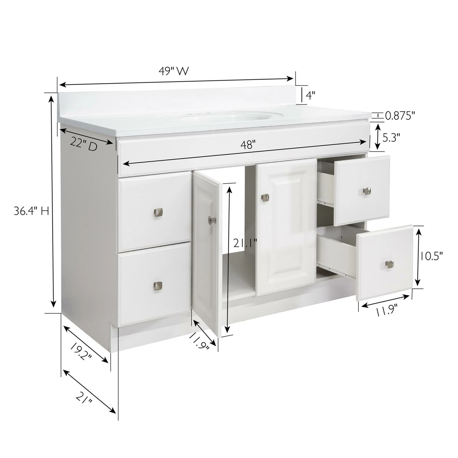 - Single sink bathroom vanity set with 2 doors and 4 fully functional drawers in a Durable, water-resistant White finish
