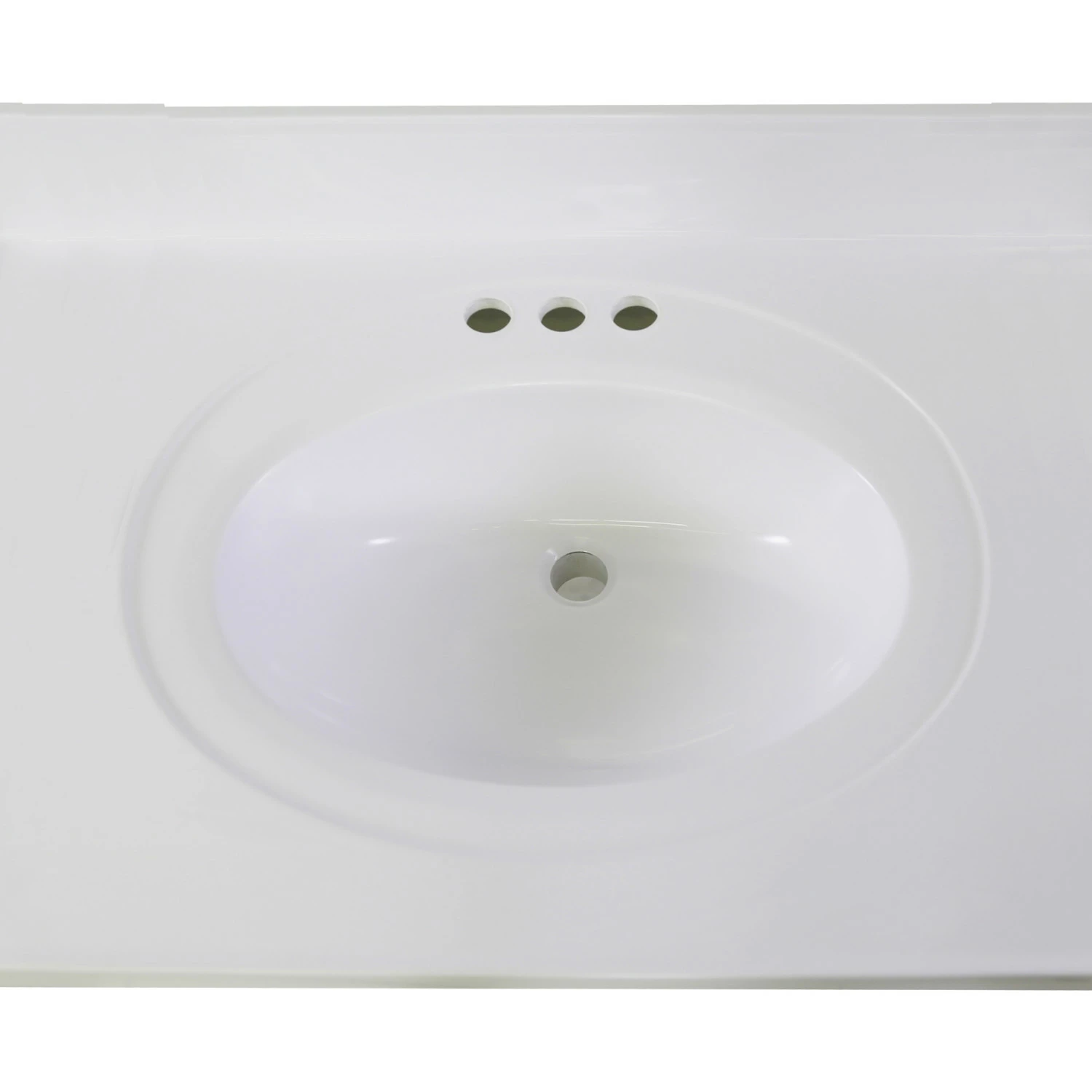 - Solid White cultured marble top has a non-porous surface that is easy to clean and stain resistant; 3 pre-drilled holes allow for a 4-inch center Mount faucet while the overflow hole and Integrated backsplash prevent water damage